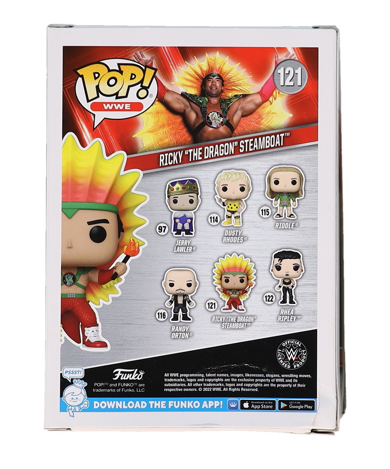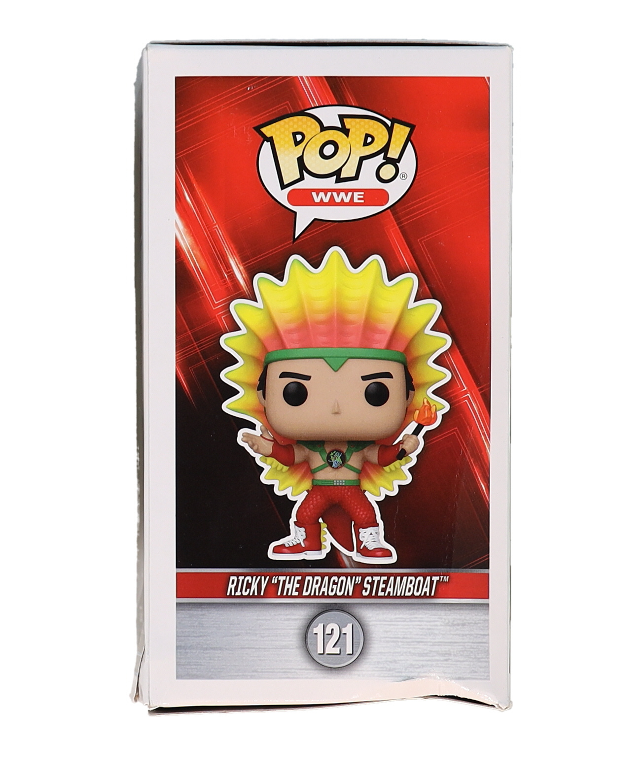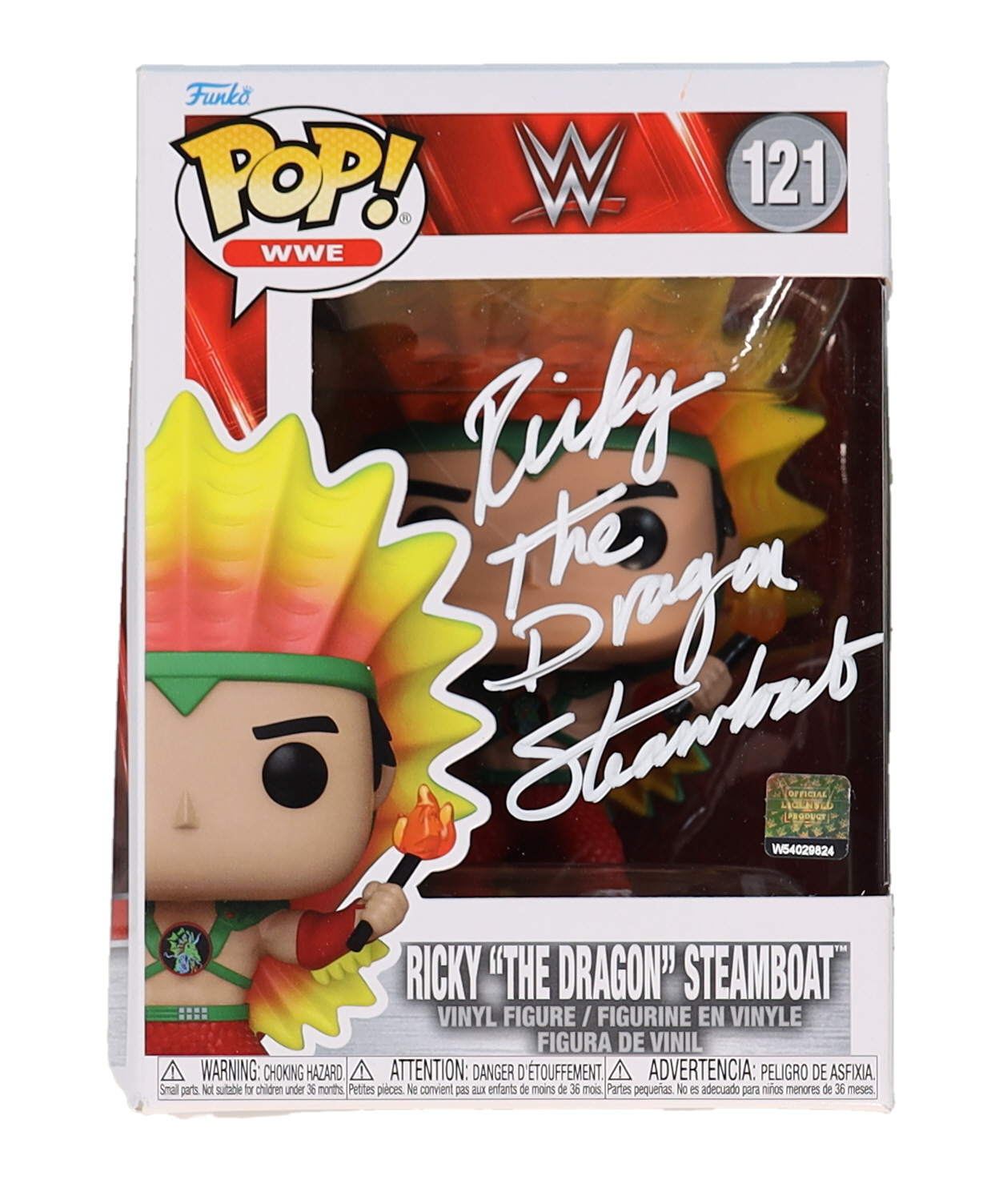 Funko Pop! figure measures approximately 4" tall. Hand-signed and inscribed on the packaging by Ricky "The Dragon" Steamboat (HOF).