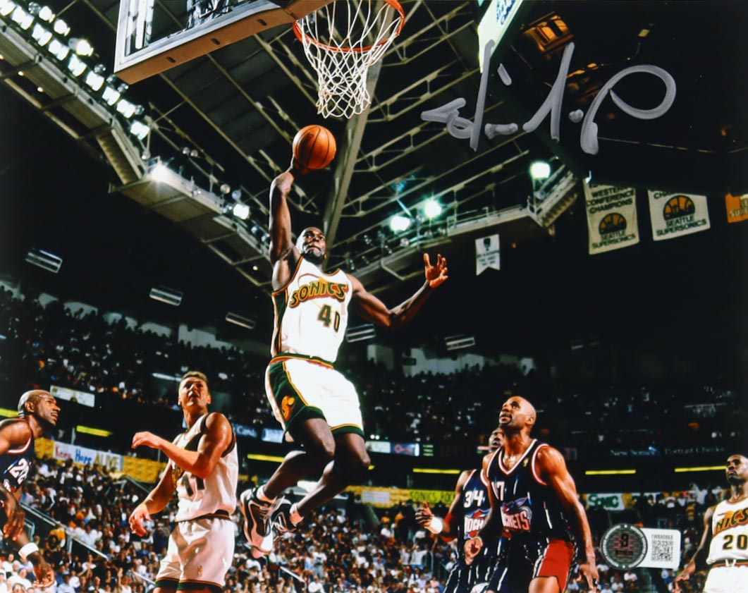 Photo measures 8" x 10" in size and has been hand-signed by Shawn Kemp (Seattle Supersonics).