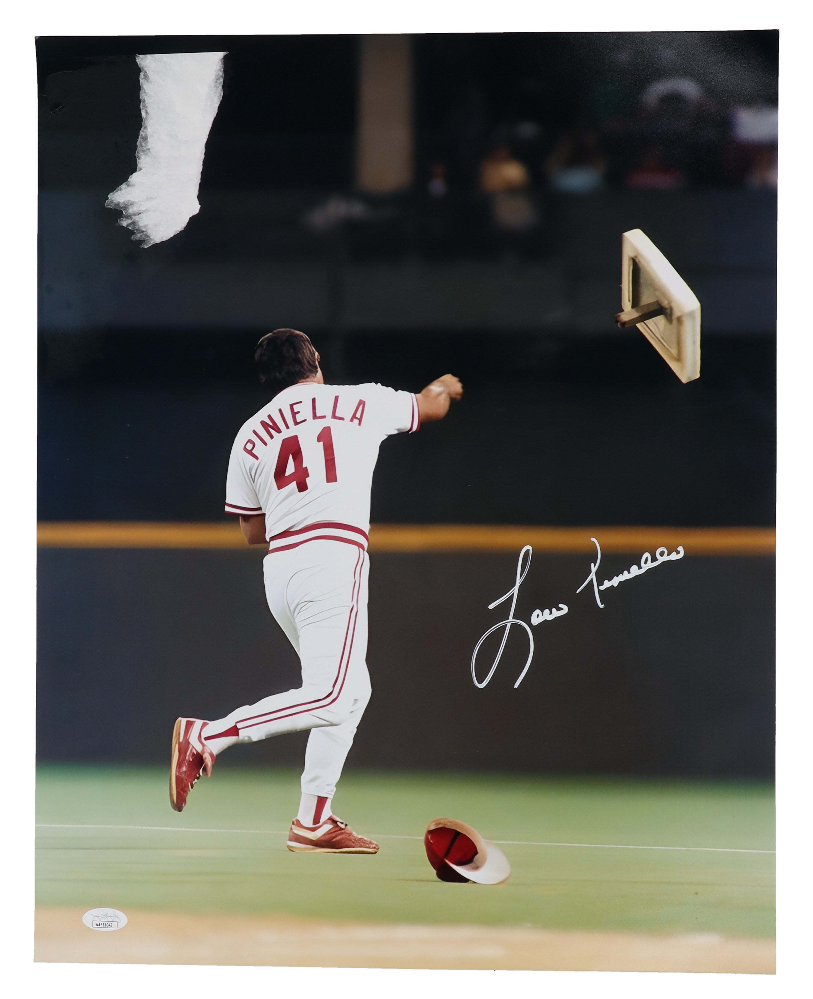 Photo measures 16" x 20" in size and has been hand-signed by Lou Piniella (Cleveland Indians). Please note, the top left corner of the photo is significantly torn.