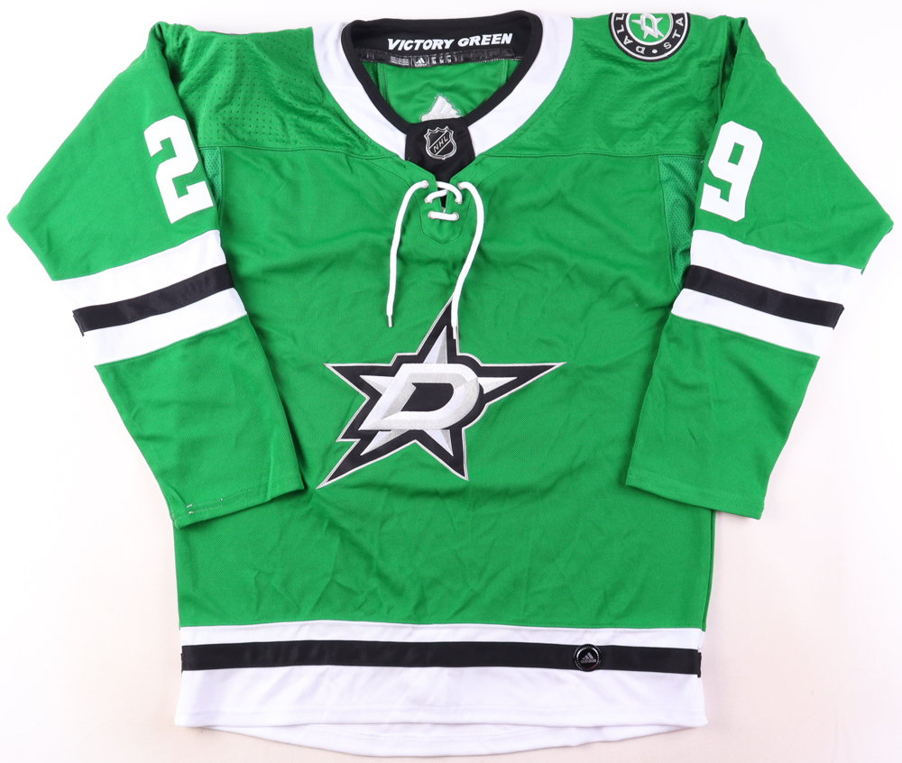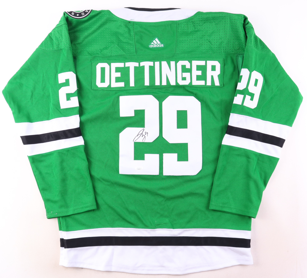 Adidas jersey with everything sewn on, size 54. Has been hand-signed by Jake Oettinger.