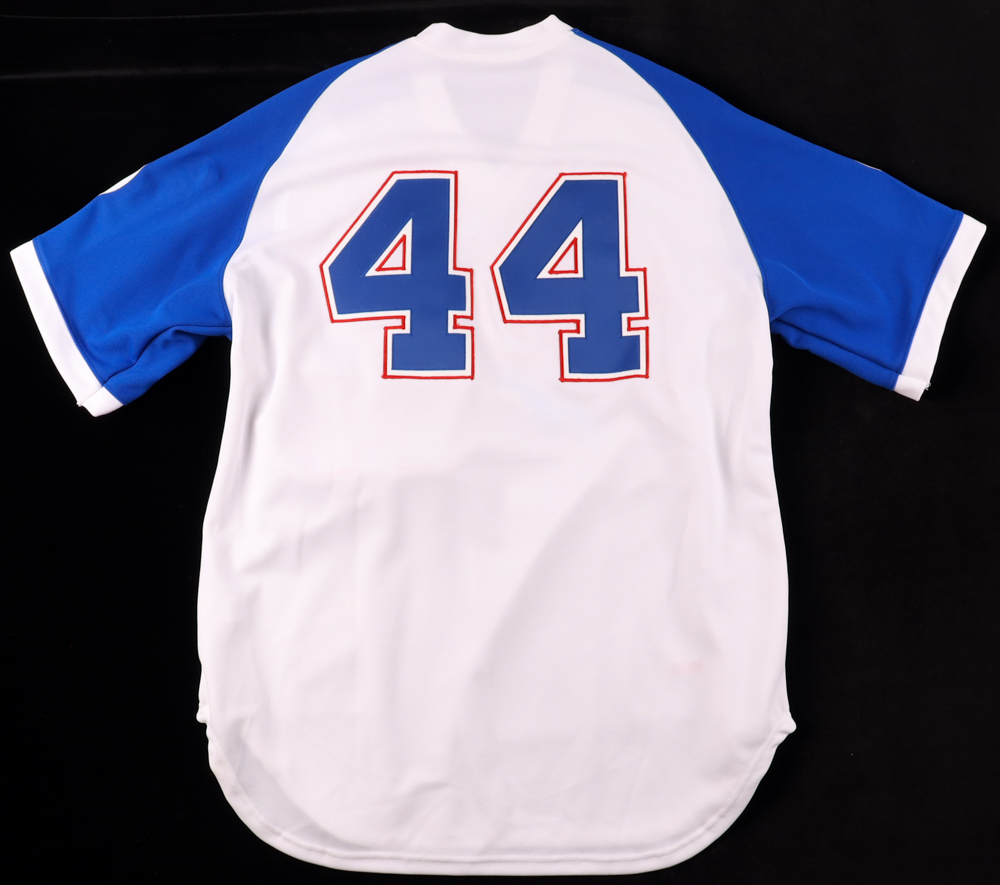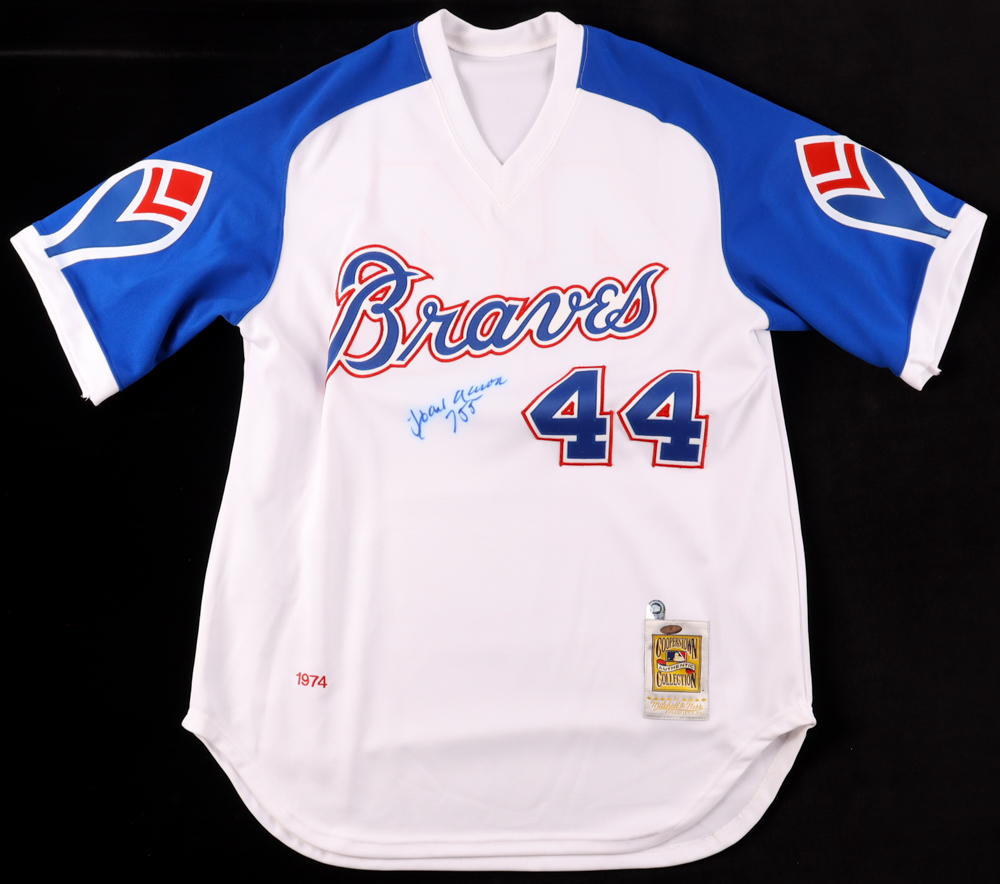 Mitchell & Ness style jersey with everything sewn on, size L. Hand-signed by Hank Aaron (D. 2021, Atlanta Braves, HOF).