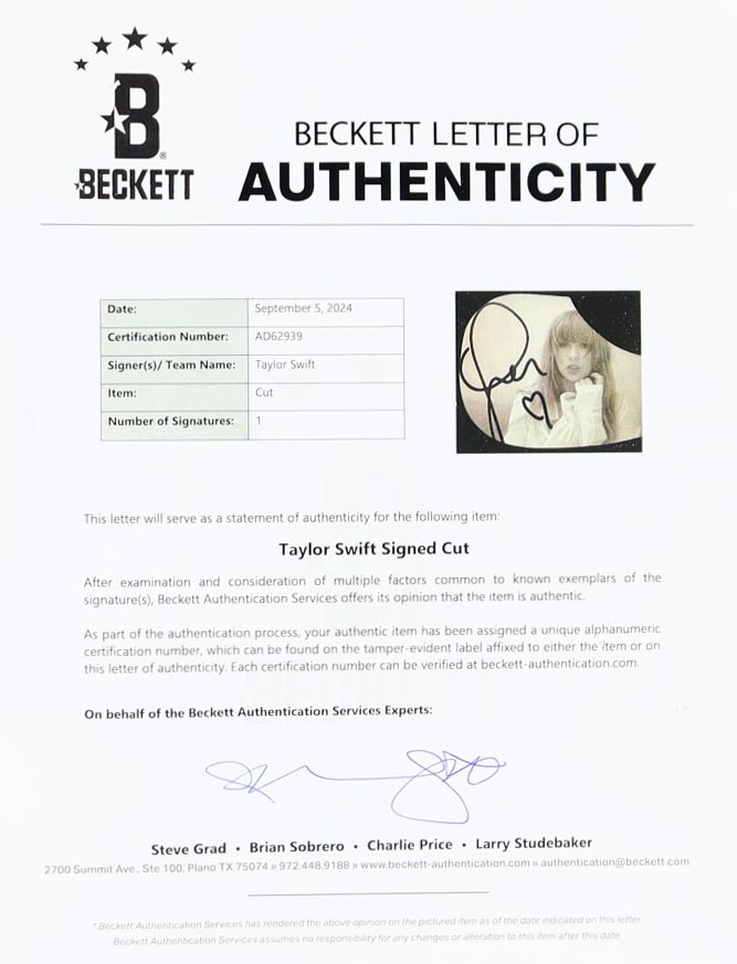 The autograph includes an official Beckett Authentication Services hologram and matching LOA for authenticity purposes.
