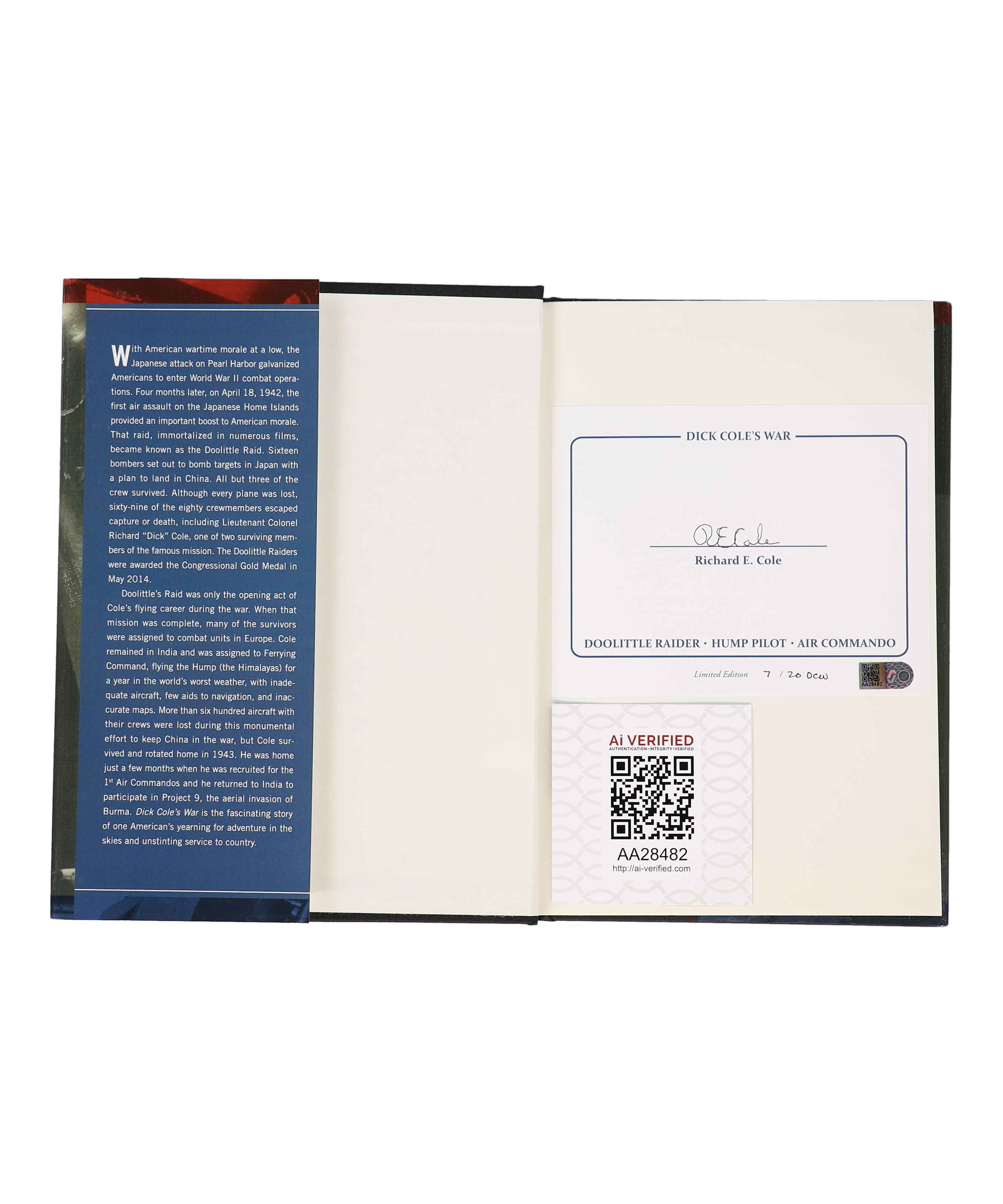 "Dick Cole's War" Hardcover Book has been hand-signed on the inside cover page by Richard E. Cole (D. 2019). The book is limited edition and has been hand-numbered #07/20.
