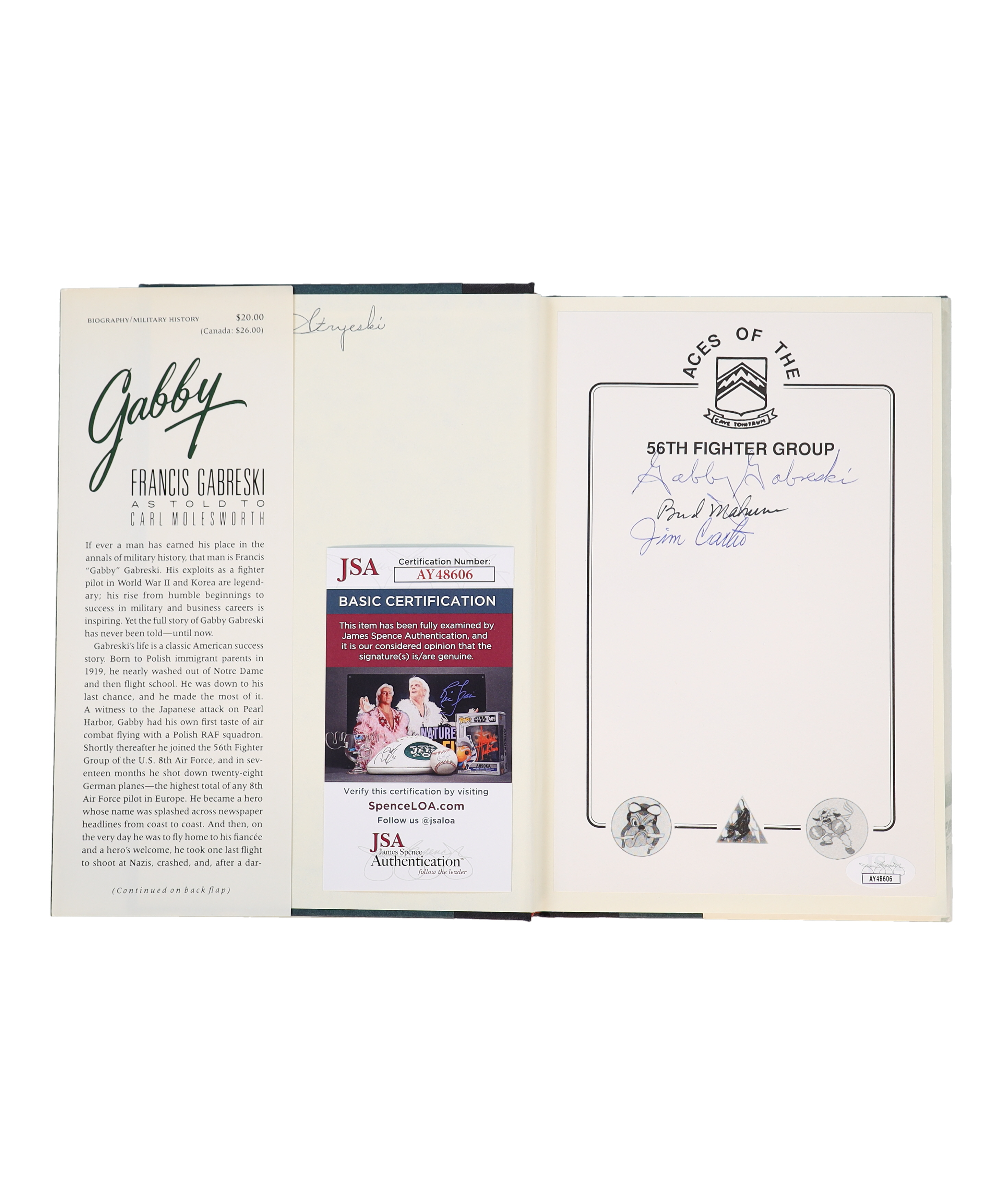 "Gabby" Hardcover Book has been hand-signed on the inside cover page by Gabby Gabreski, Walker "Bud" Mahurin, and James Carter.