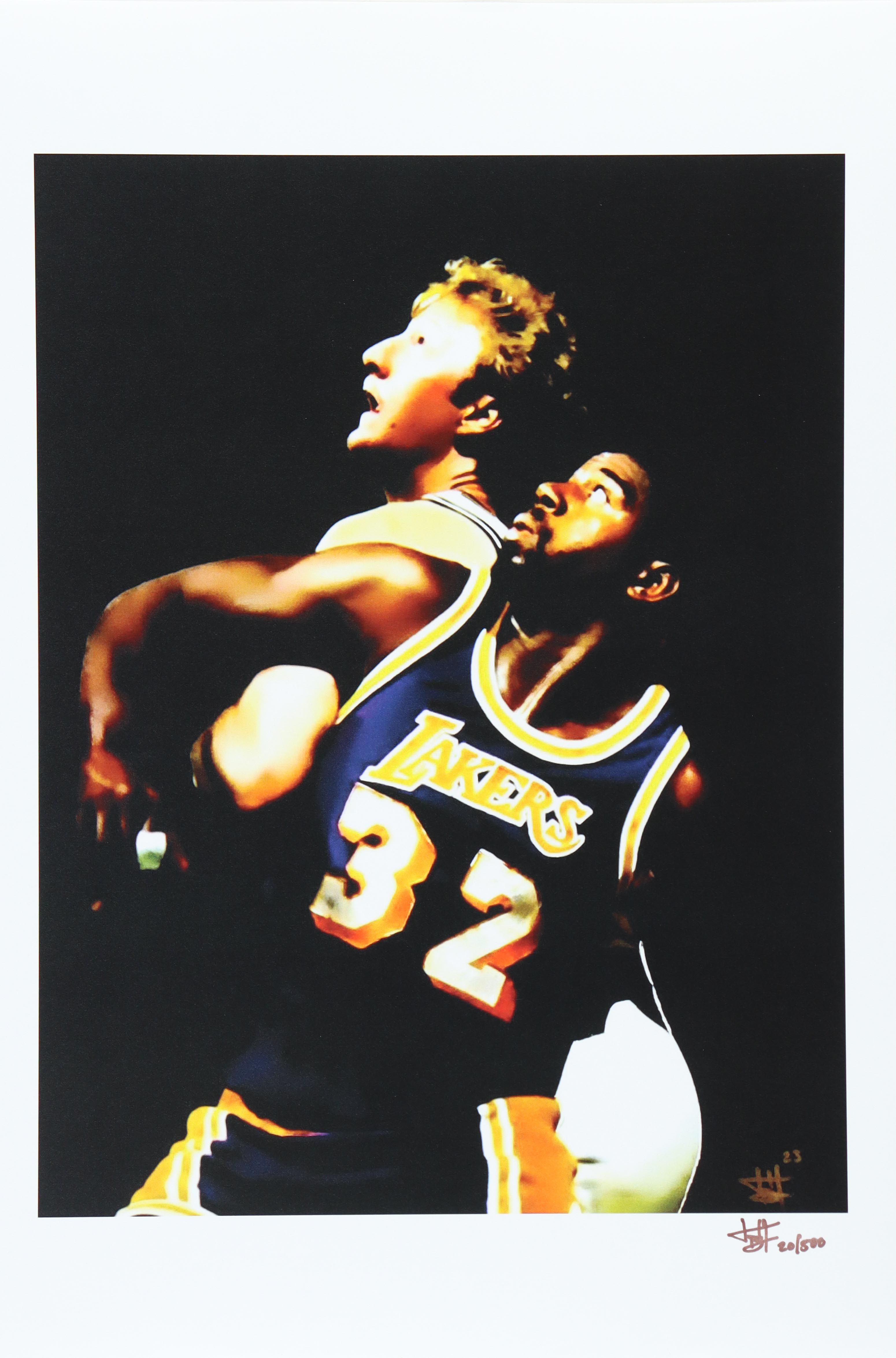 Print measures approximately 12" x 18" in size. The piece is hand-signed and numbered by the artist, Joshua Barton and features Magic Johnson (Los Angeles Lakers, HOF) and Larry Bird (Boston Celtics, HOF).