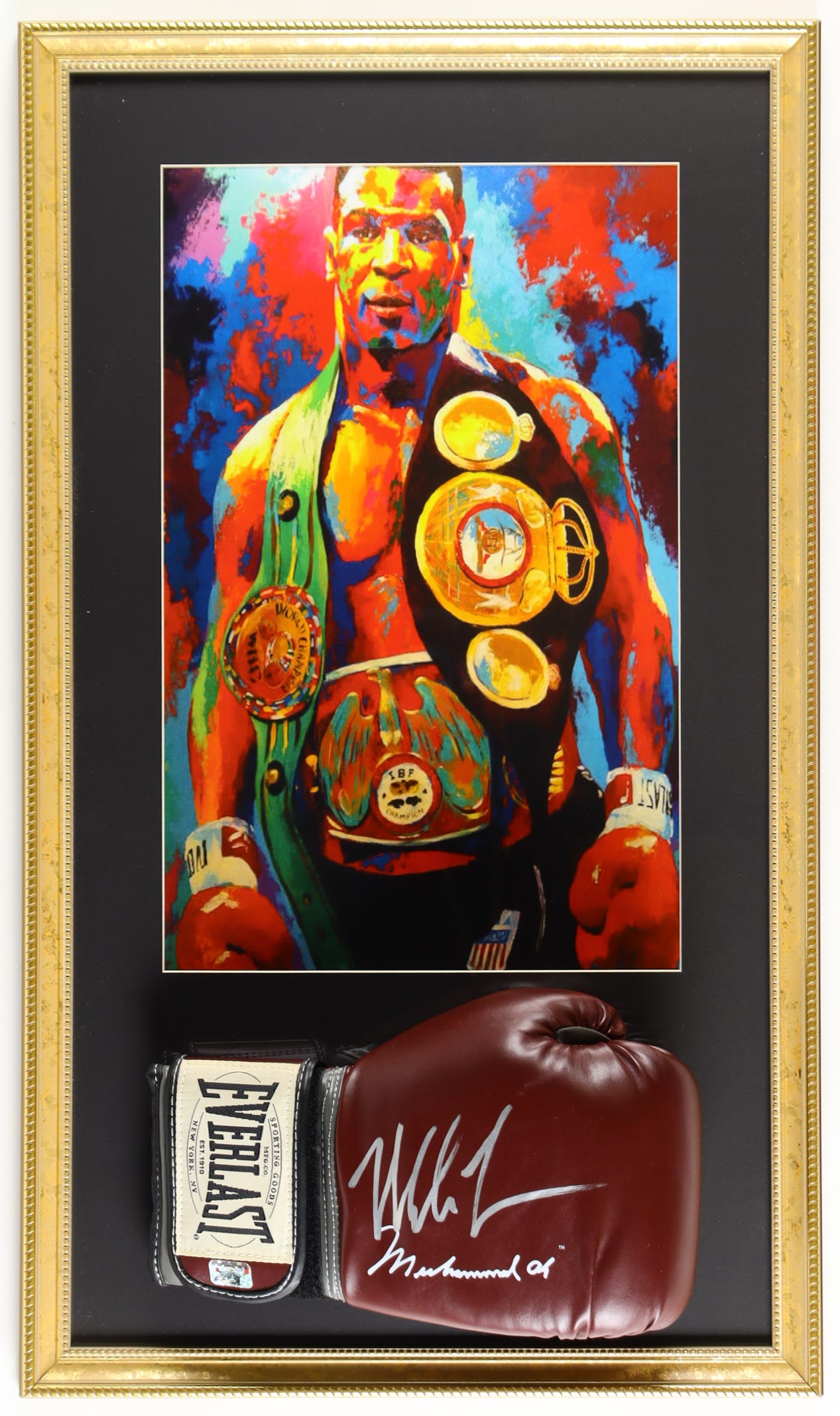 Custom frame measures approximately 17" x 29" in size and features an Vintage Everlast Muhammad Ali Model boxing glove that has been hand-signed by Mike Tyson (HOF). Display also includes an art print.