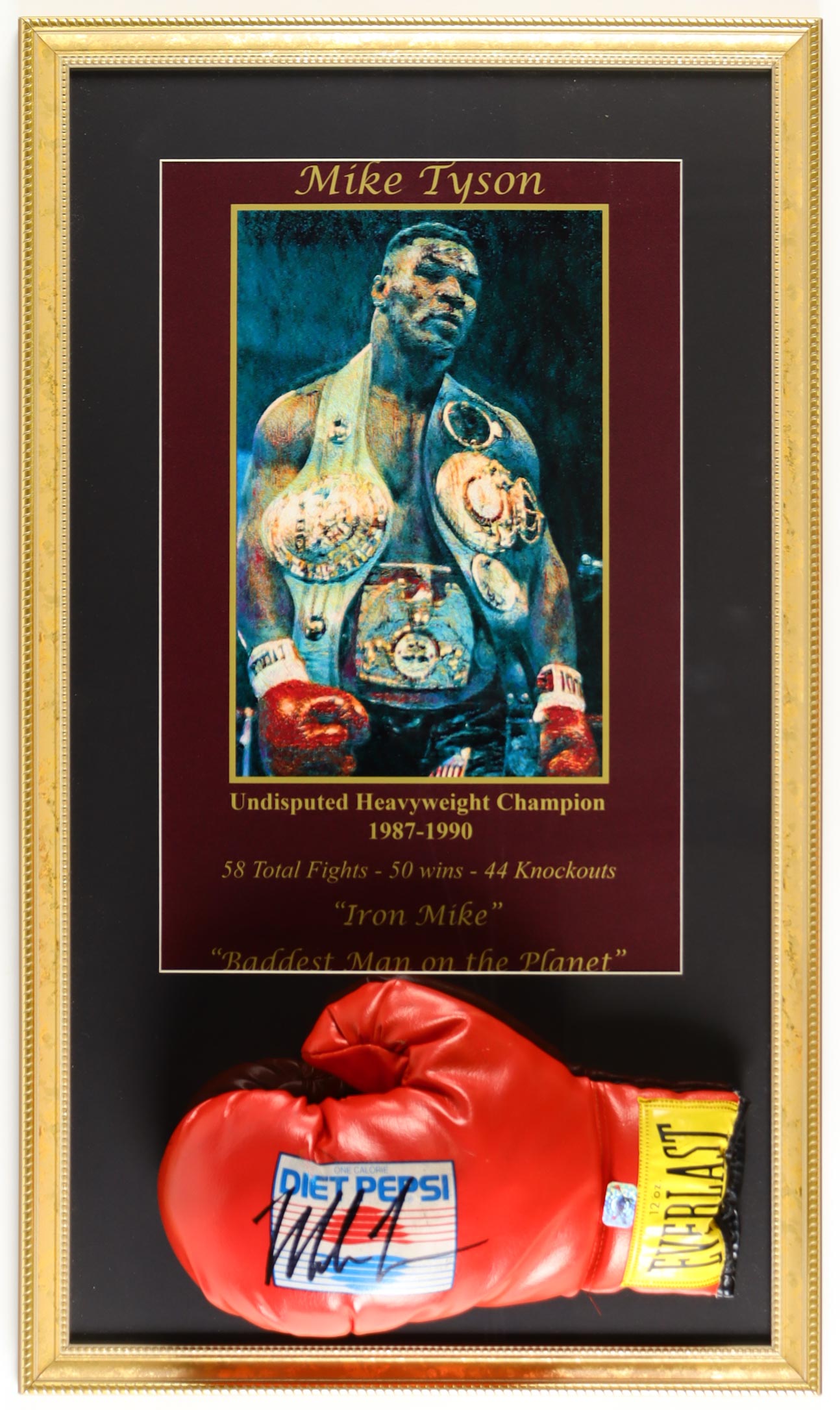 Custom frame measures approximately 17" x 29" in size and features an Vintage Everlast Diet Pepsi boxing glove that has been hand-signed by Mike Tyson (HOF). Display also includes a photo.