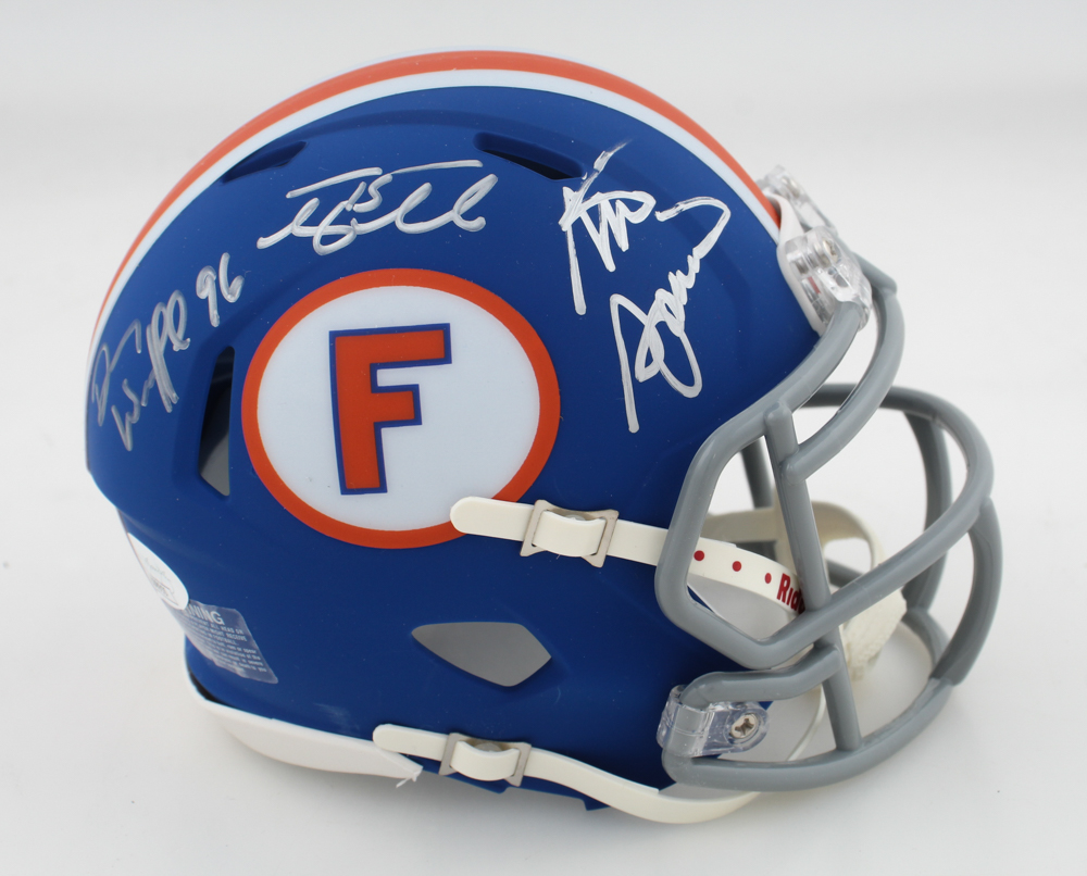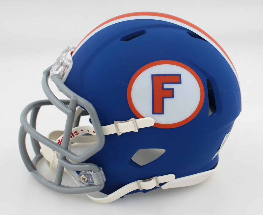 Riddell Florida Gators Speed mini helmet. Hand-signed by Steve Spurrier, Danny Wuerffel and Tim Tebow.
