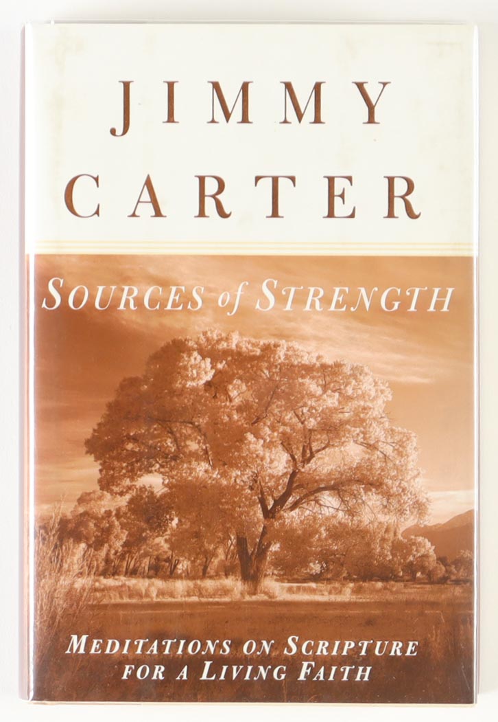 "Sources Of Strength" hardcover book. Hand-signed on the inside title page by Jimmy Carter (D. 2024). Please note, there is scuffing and edge wear on the dust jacket of the book.