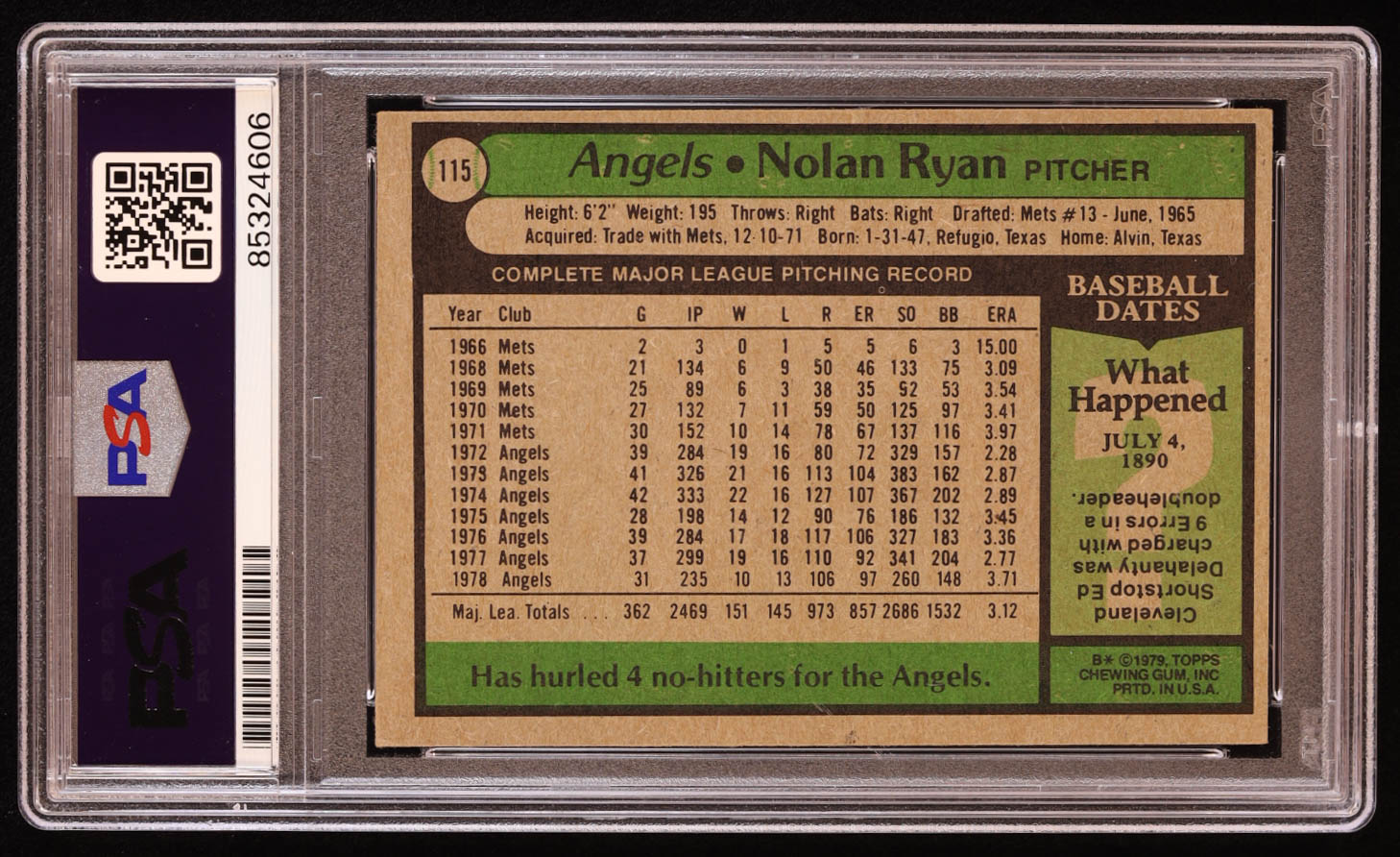Nolan Ryan Signed 1979 Topps #115 Inscribed "108.5 MPH Fastball" (PSA | Autograph Grade 10)