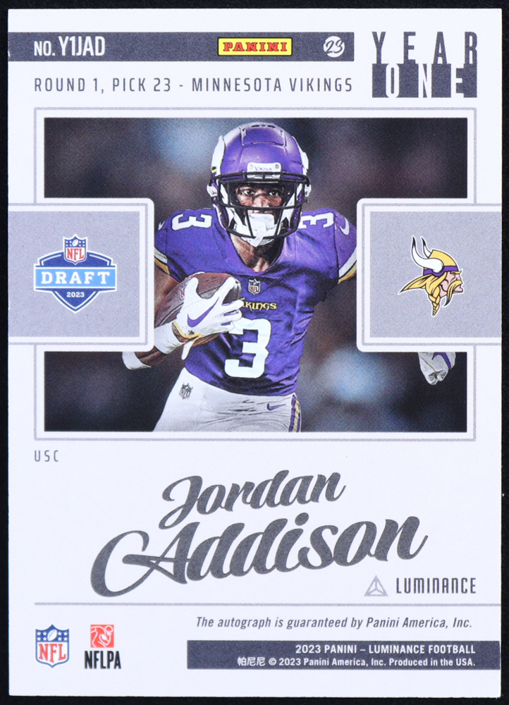 Jordan Addison 2023 Panini Luminance Year One Signatures RPS #6 RC