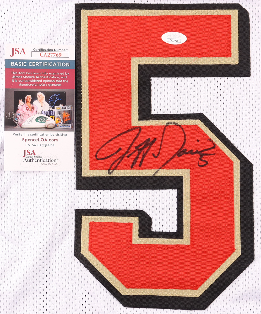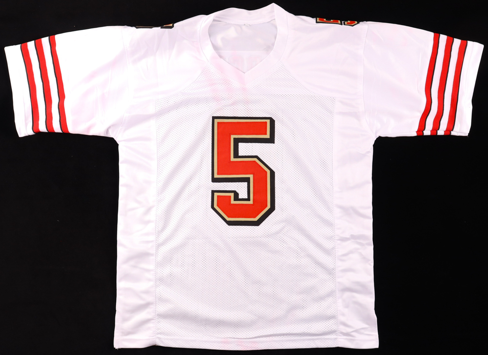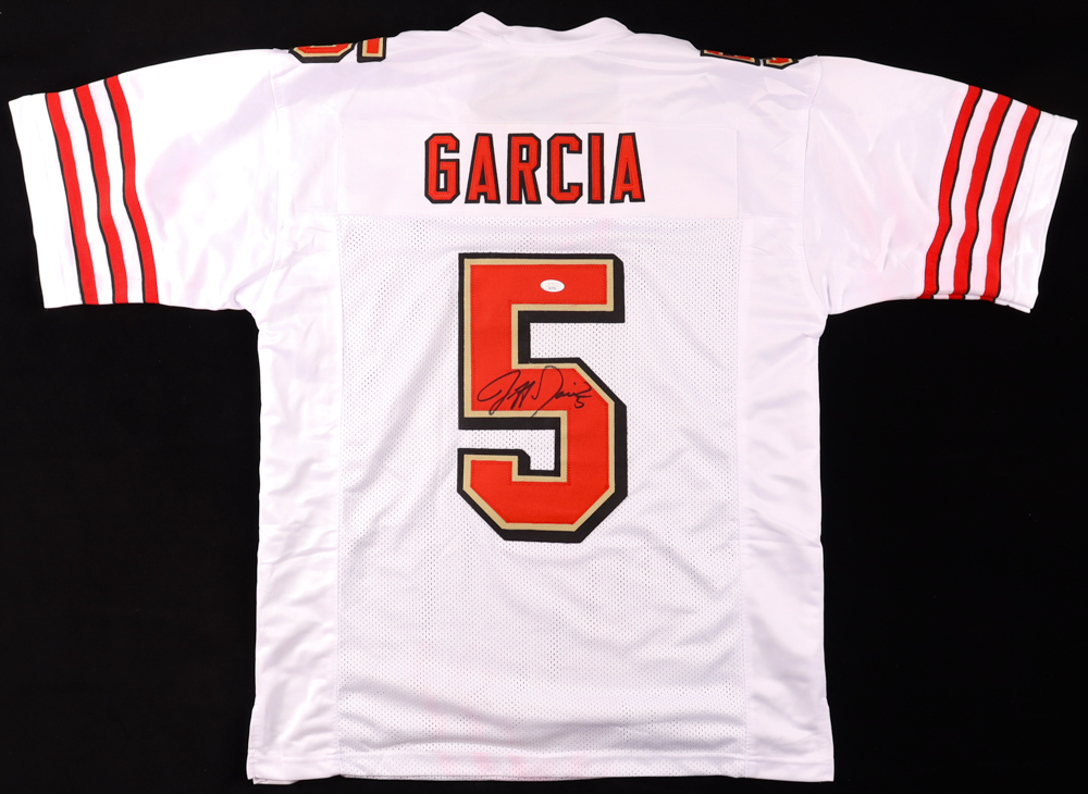 Custom jersey with everything sewn on, size XL. Hand-signed by Jeff Garcia. Please note, there is red staining throughout the jersey.