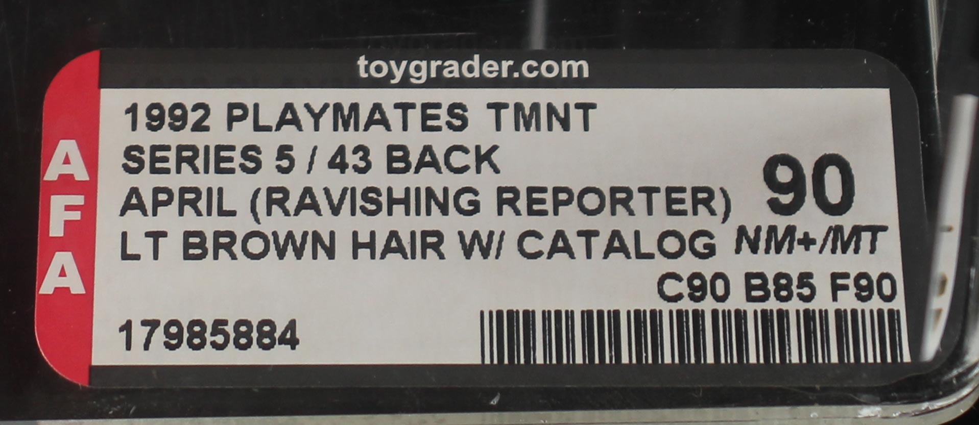 1992 Playmates "Teenage Mutant Ninja Turtles" April, the Ravishing Reporter action figure measures approximately 5" tall. Note the catalog and light brown hair. Encapsulated and graded 9 by AFA.