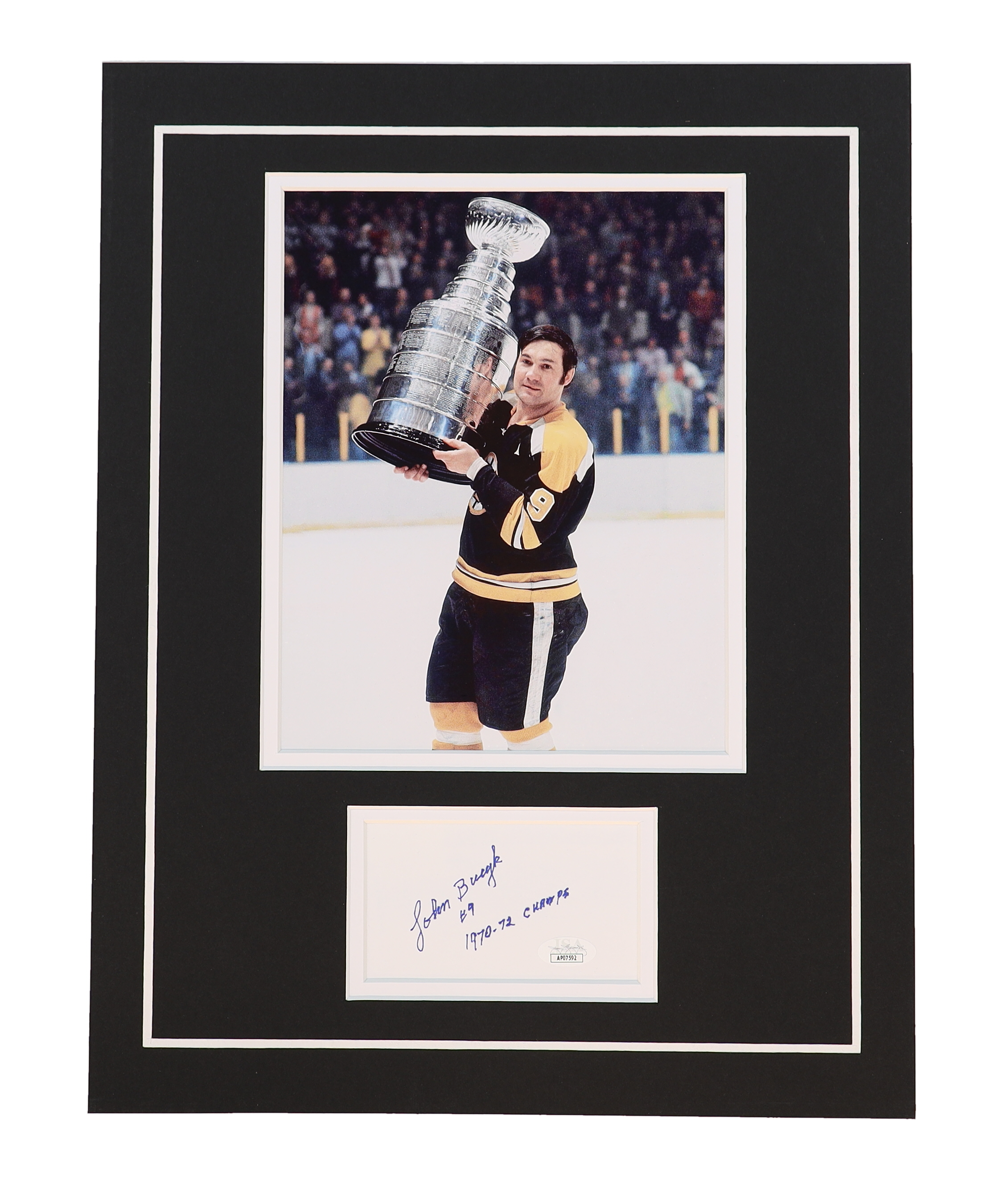 Johnny Bucyk Signed Bruins Matted Cut Display Inscribed "1970-72 Champs" (JSA)