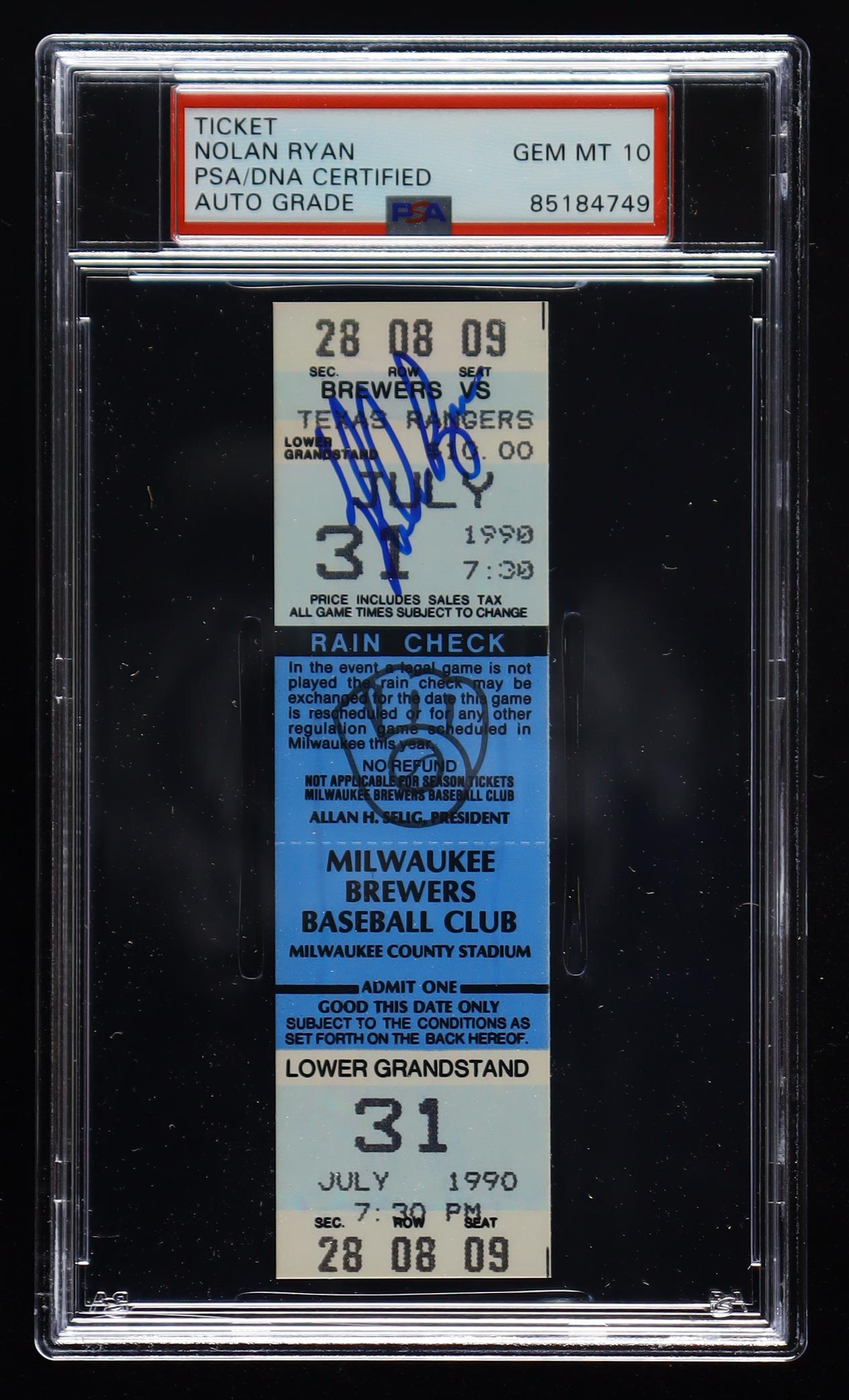 Ticket stub is dated July 31, 1990. Hand-signed by Nolan Ryan (Texas Rangers, HOF).