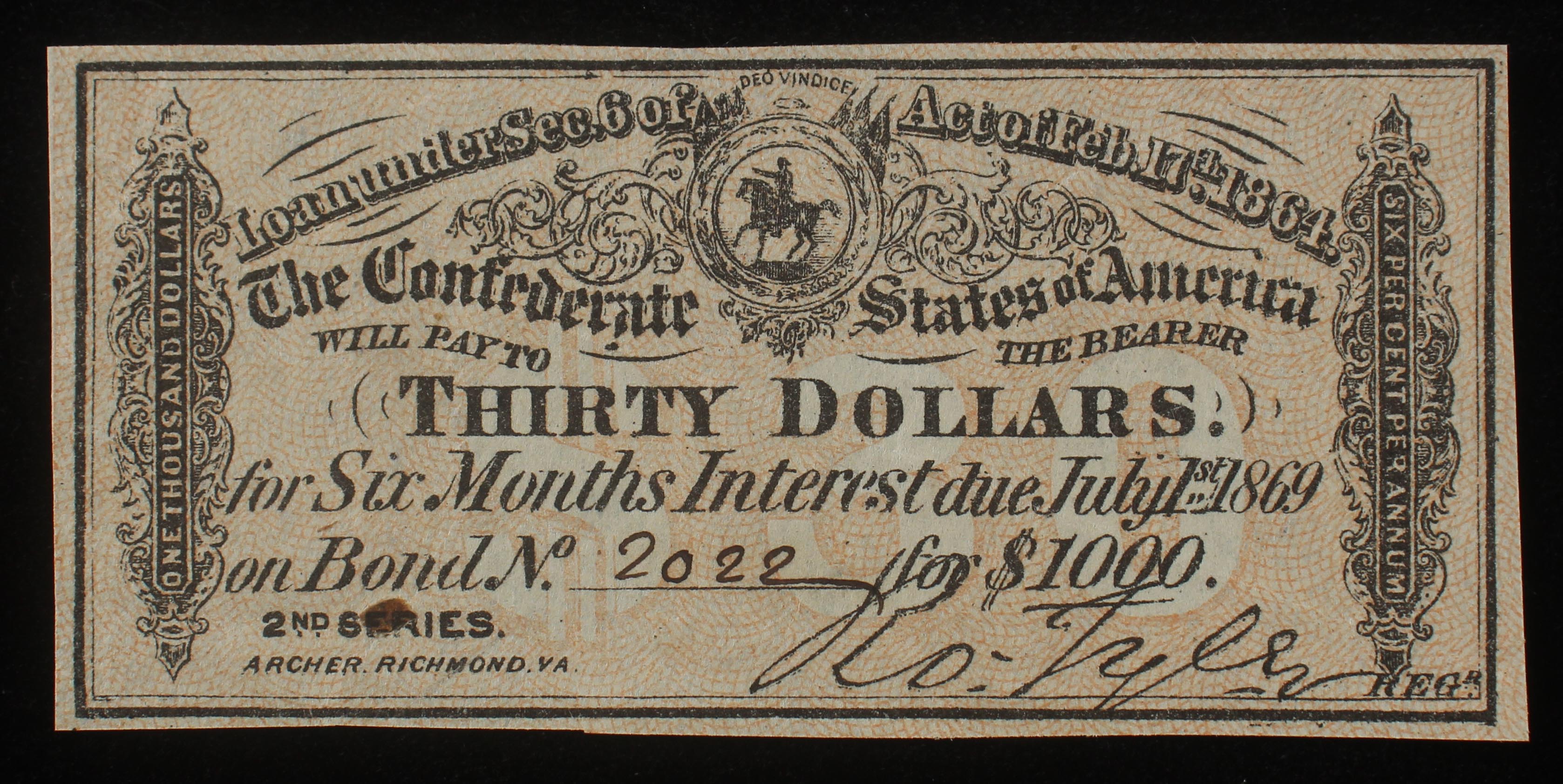 1864 $30 Confederate States of America Richmond CSA Bank Note Bond