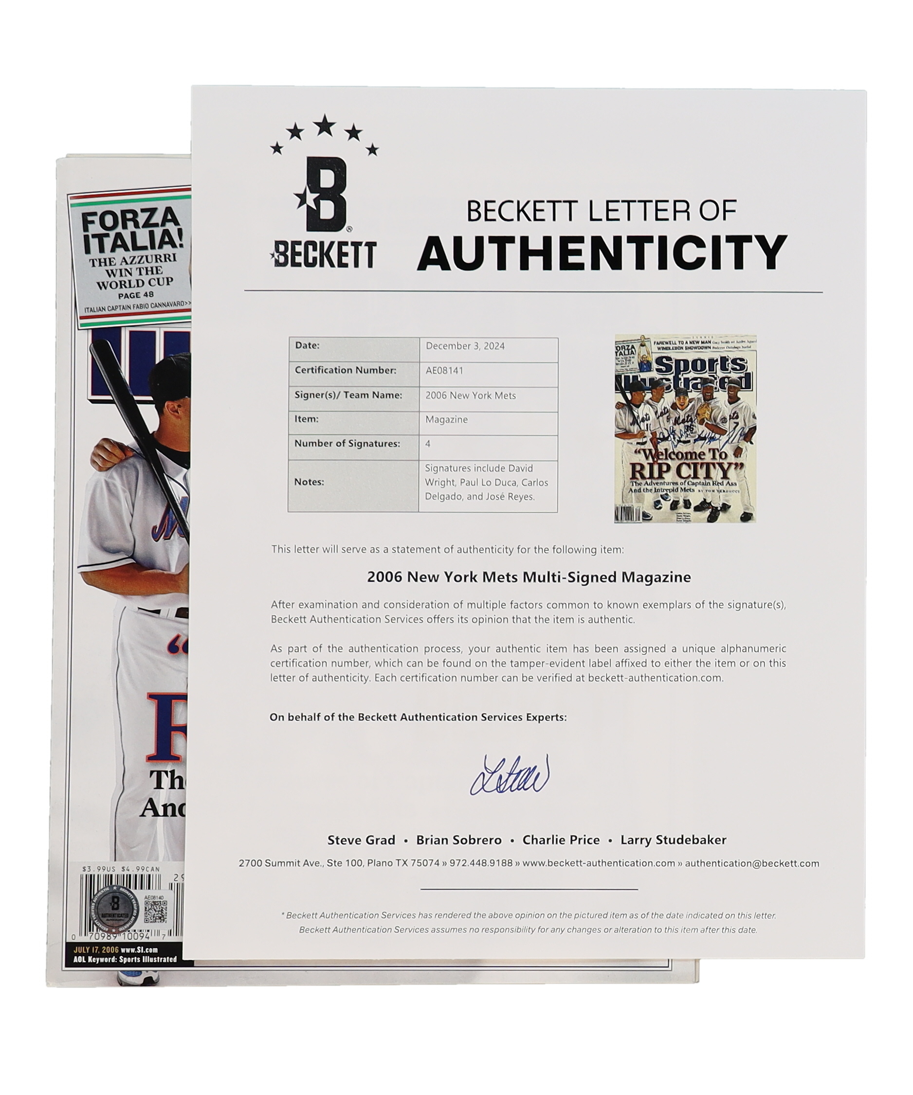 July 17, 2006 issue of "Sports Illustrated" magazine. Hand-signed on the front cover by David Wright, Paul Lo Duca, Carlos Delgado, and Jose Reyes (New York Mets).