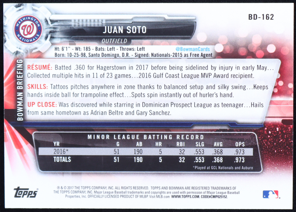 Juan Soto 2017 Bowman Draft #BD162 RC