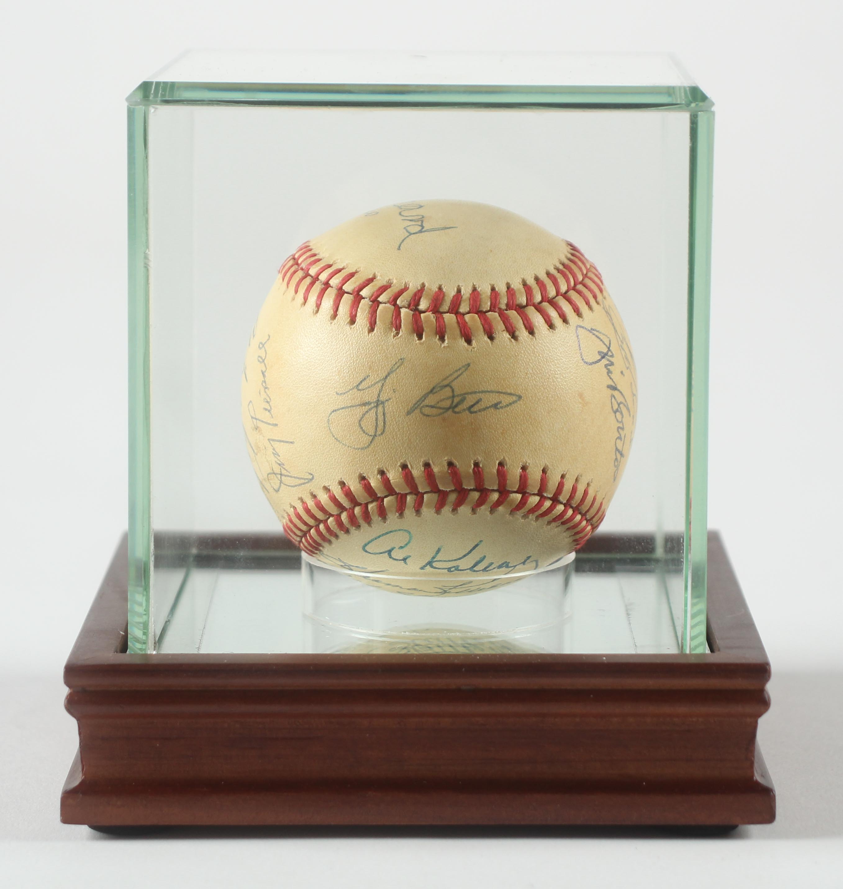 OAL Baseball Signed by (16) with Carl Yastrzemski, Yogi Berra, Buck Leonard, Al Kaline, Harmon Killebrew with Display Case (PSA)