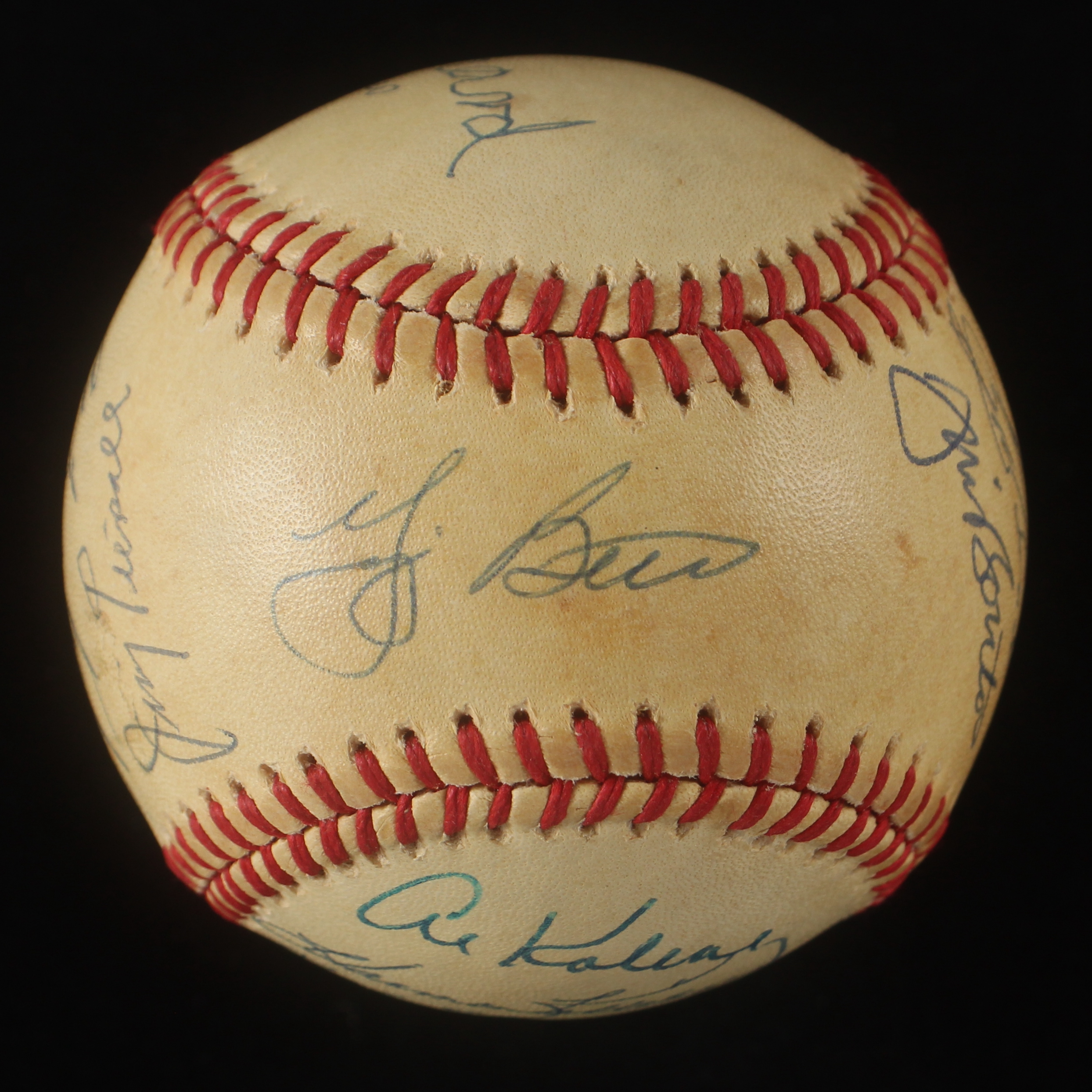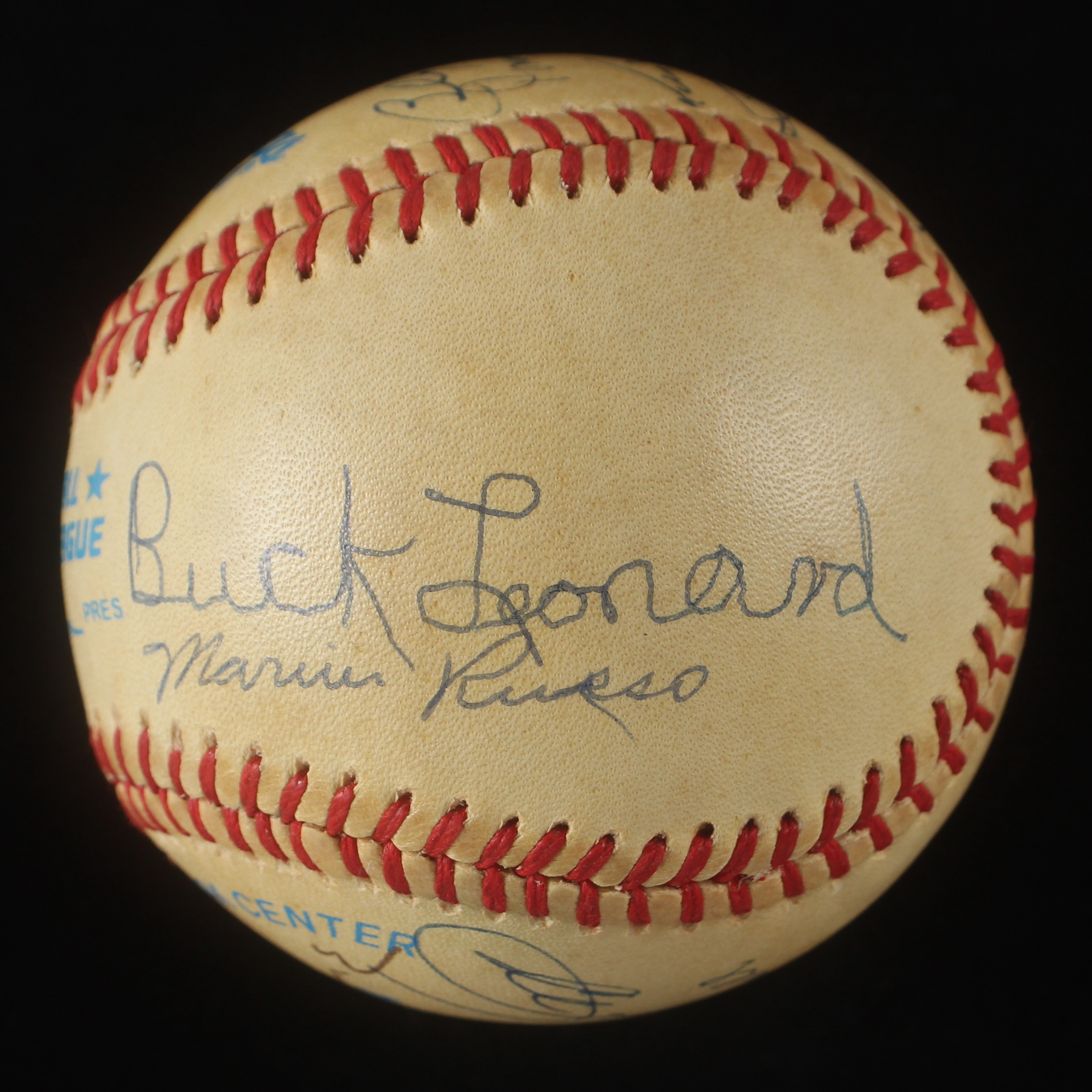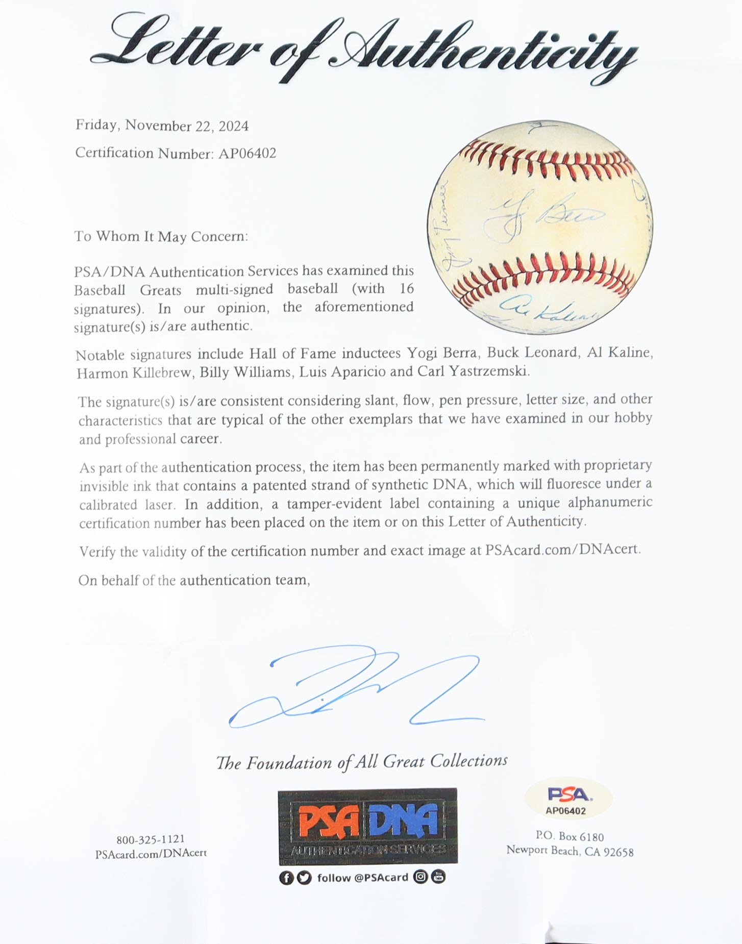 Rawlings Official American League Baseball has been hand-signed by (16) Baseball Greats with Yogi Berra (HOF), Buck Leonard (HOF), Al Kaline (HOF), Harmon Killebrew (HOF), Billy Williams (HOF), Luis Aparicio (HOF), Carl Yastrzemski (HOF), Mel Stottlemyre, Marius Russo, and (7) others.
