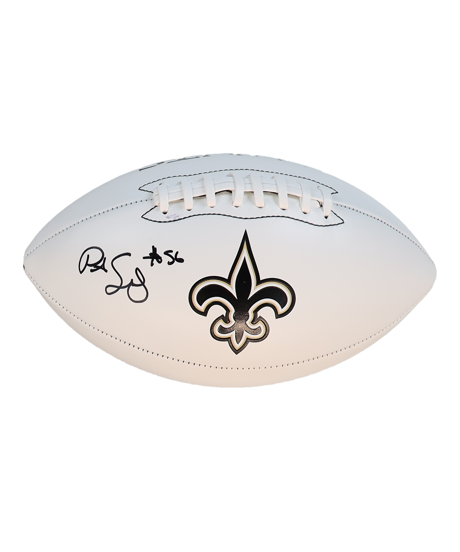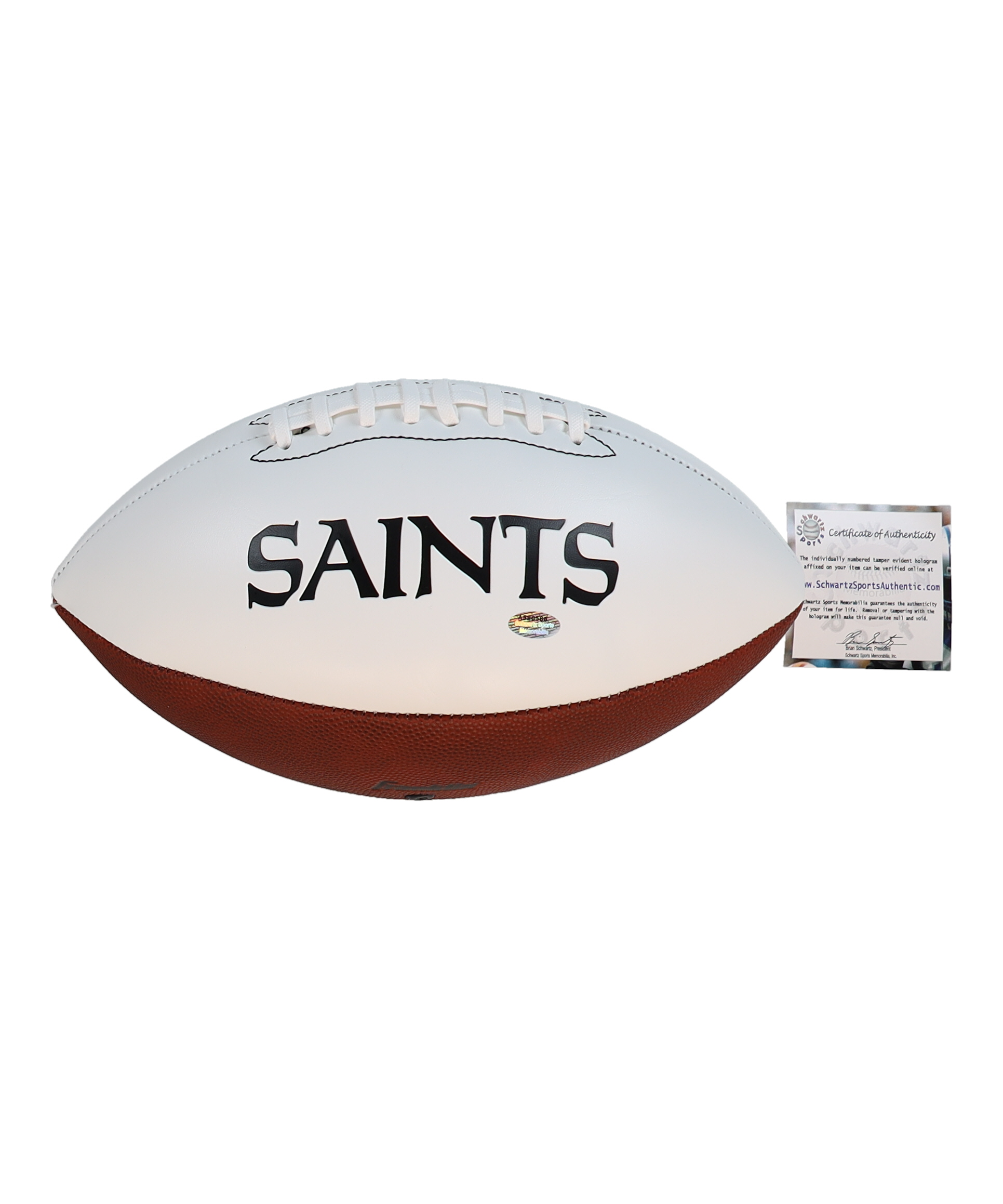 Franklin New Orleans Saints logo football has been hand-signed by Pat Swilling. Please note, there is staining near the laces.