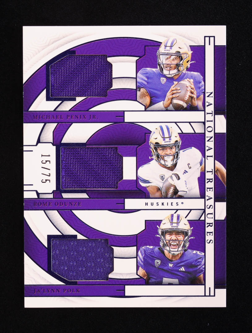 Ja'Lynn Polk / Rome Odunze / Michael Penix Jr. 2024 Panini National Treasures Collegiate Team Trio Materials Blue #7 RC #15/75
