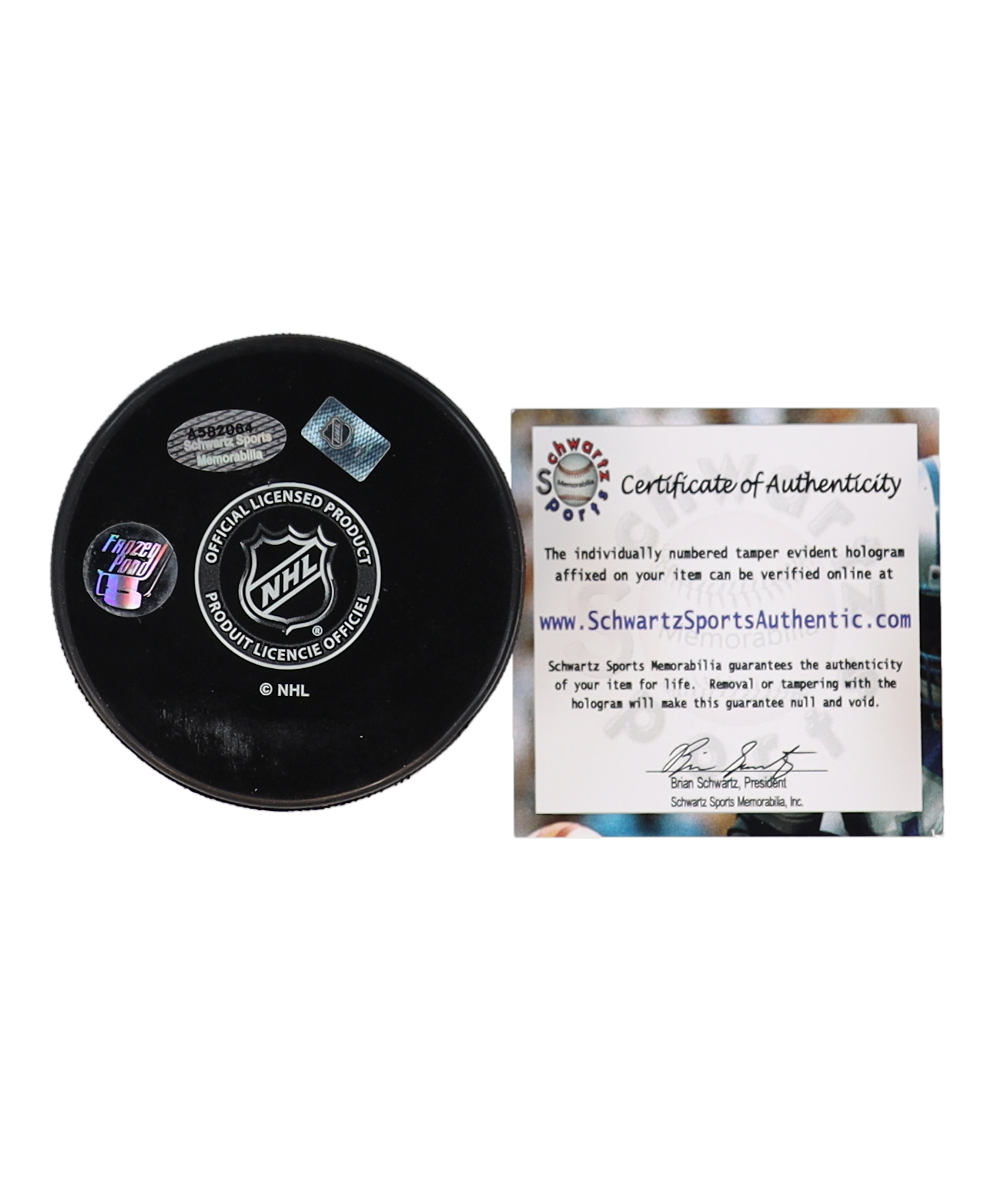 Philadelphia Flyers logo hockey puck has been hand-signed and inscribed by Bernie Parent (HOF).