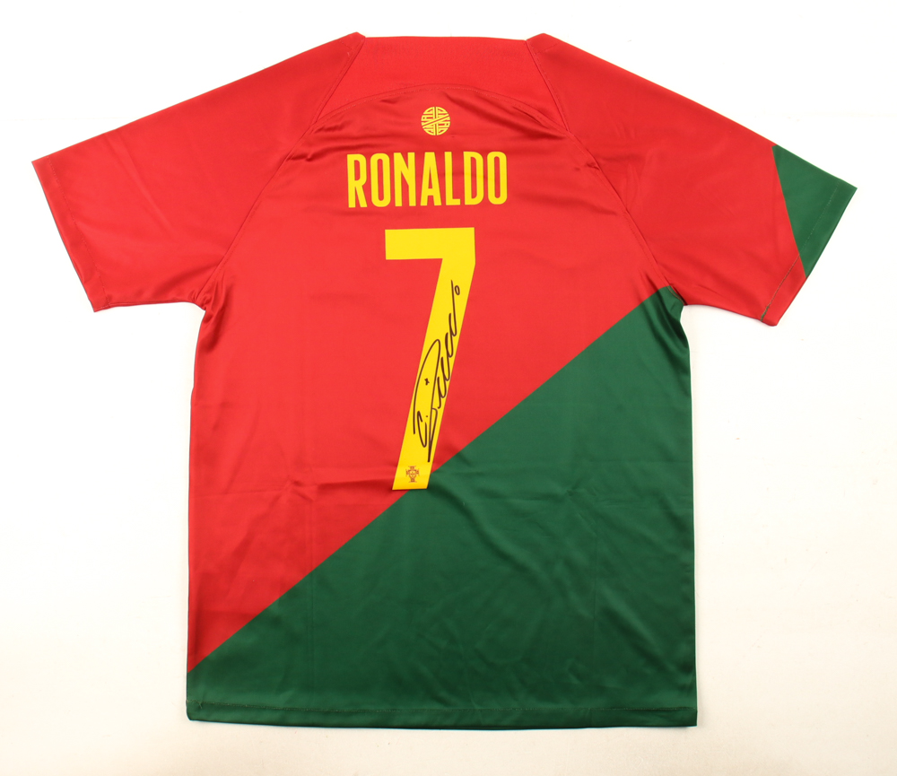 Nike style jersey with everything pressed on, size L. Hand-signed by Cristiano Ronaldo.
