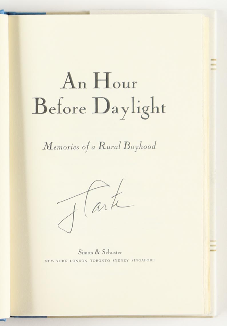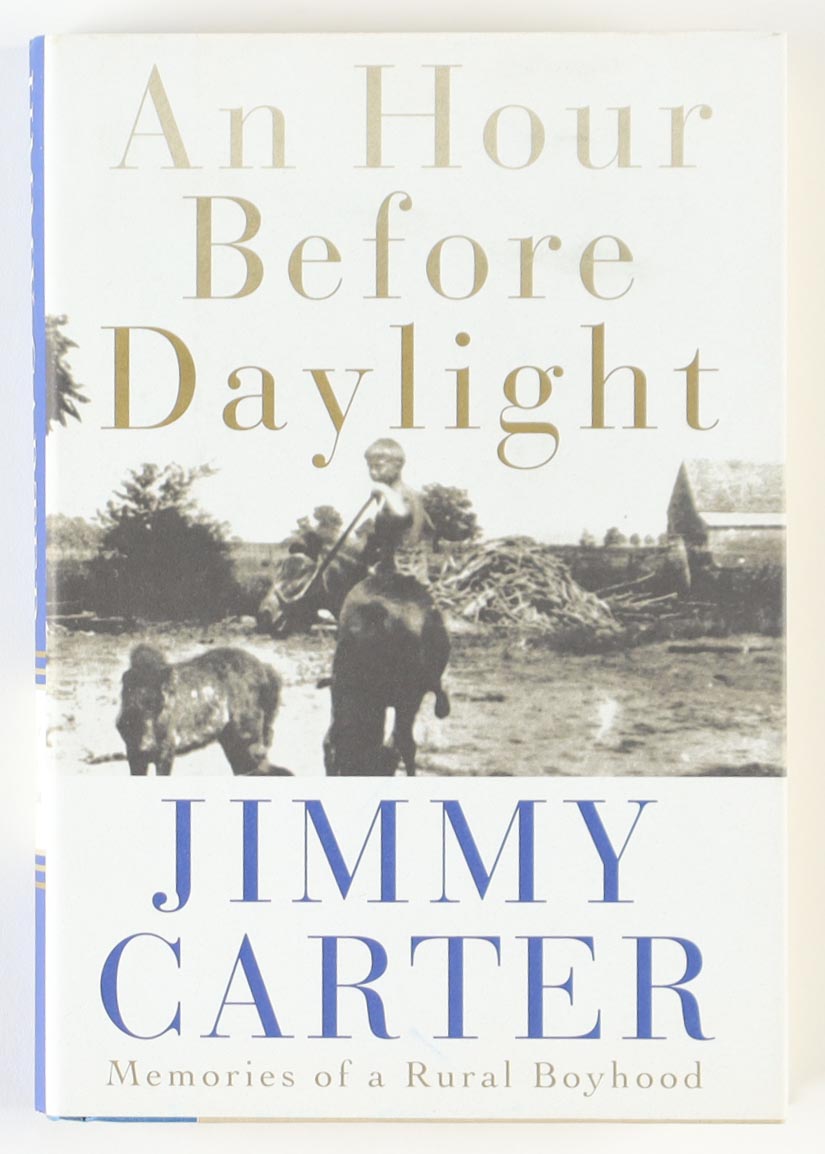 "An Hour Before Daylight" hardcover book. Hand-signed on the inside cover page by Jimmy Carter (D. 2024).