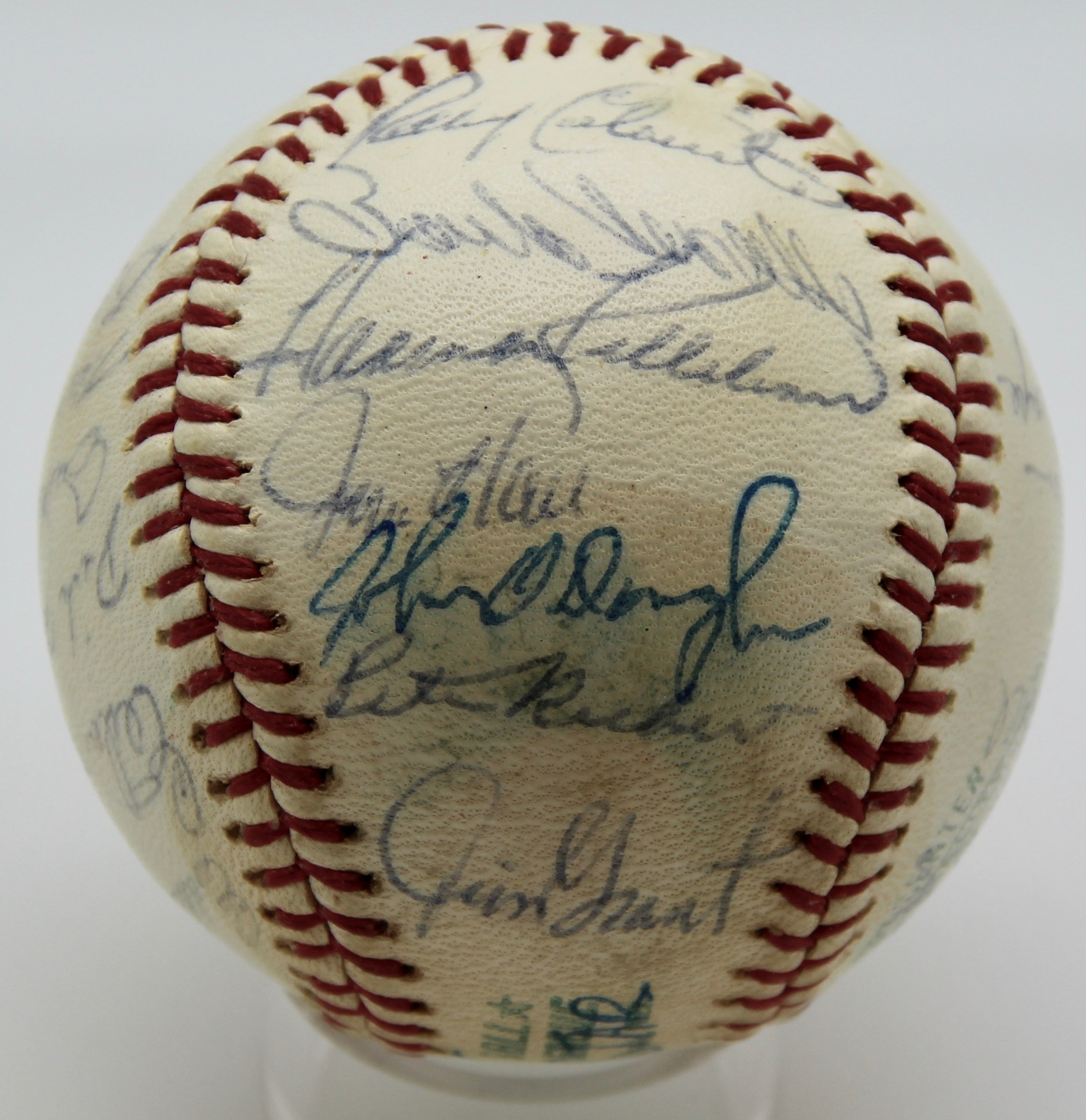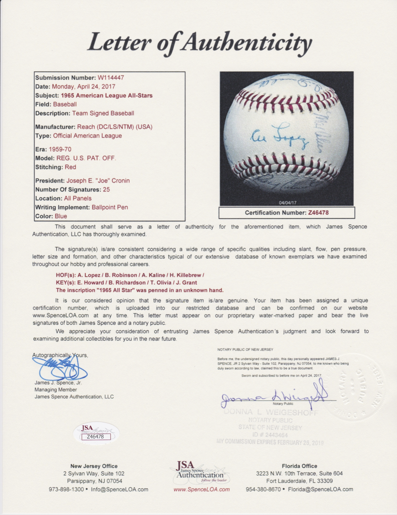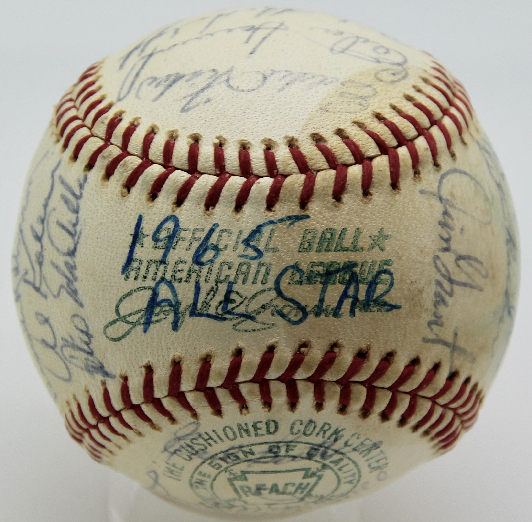 Official National League baseball. Hand-signed in blue ink pen by (25) of the 1965 American League All-Stars including Al Lopez, Eddie Fisher, Elston Howard, Dick McAuliffe, Bill Freehan, Milt Pappas, Bob Lee, Earl Battey, Sam McDowell, Bob Richardson, Mel Stottlemyre, Max Alvis, Vic Davalillo, Tony Olivia, Willie Horton, Brooks Robinson, Al Kaline, Felix Mantilla, Rocky Colavito, Zoilo Versalles, Harmon Killebrew, Jimmie Hall, John O'Donoghue, Pete Richert and Jim Grant.