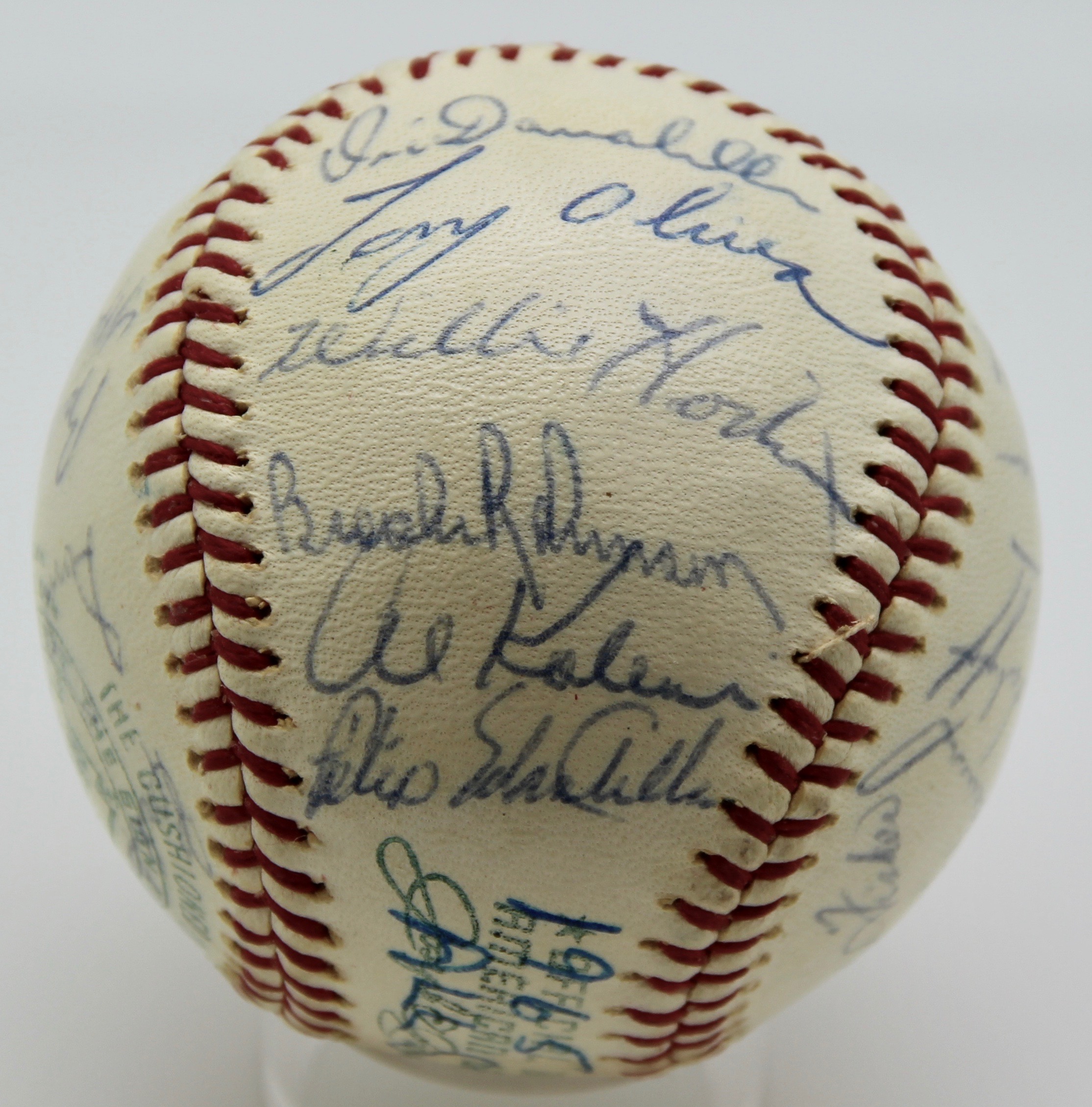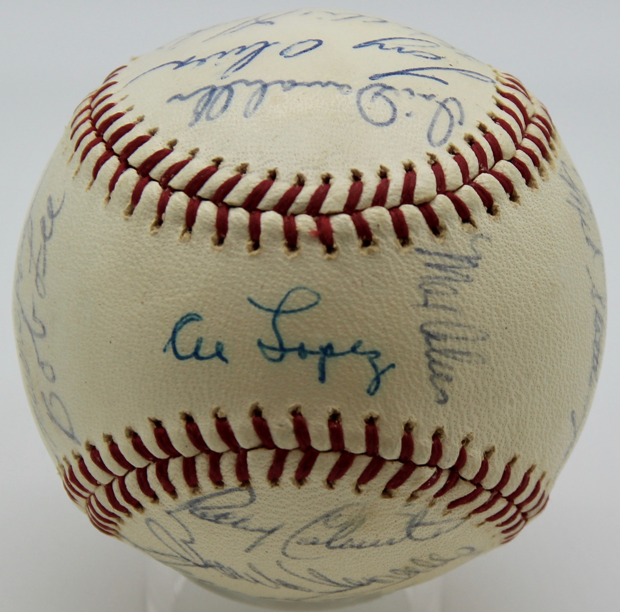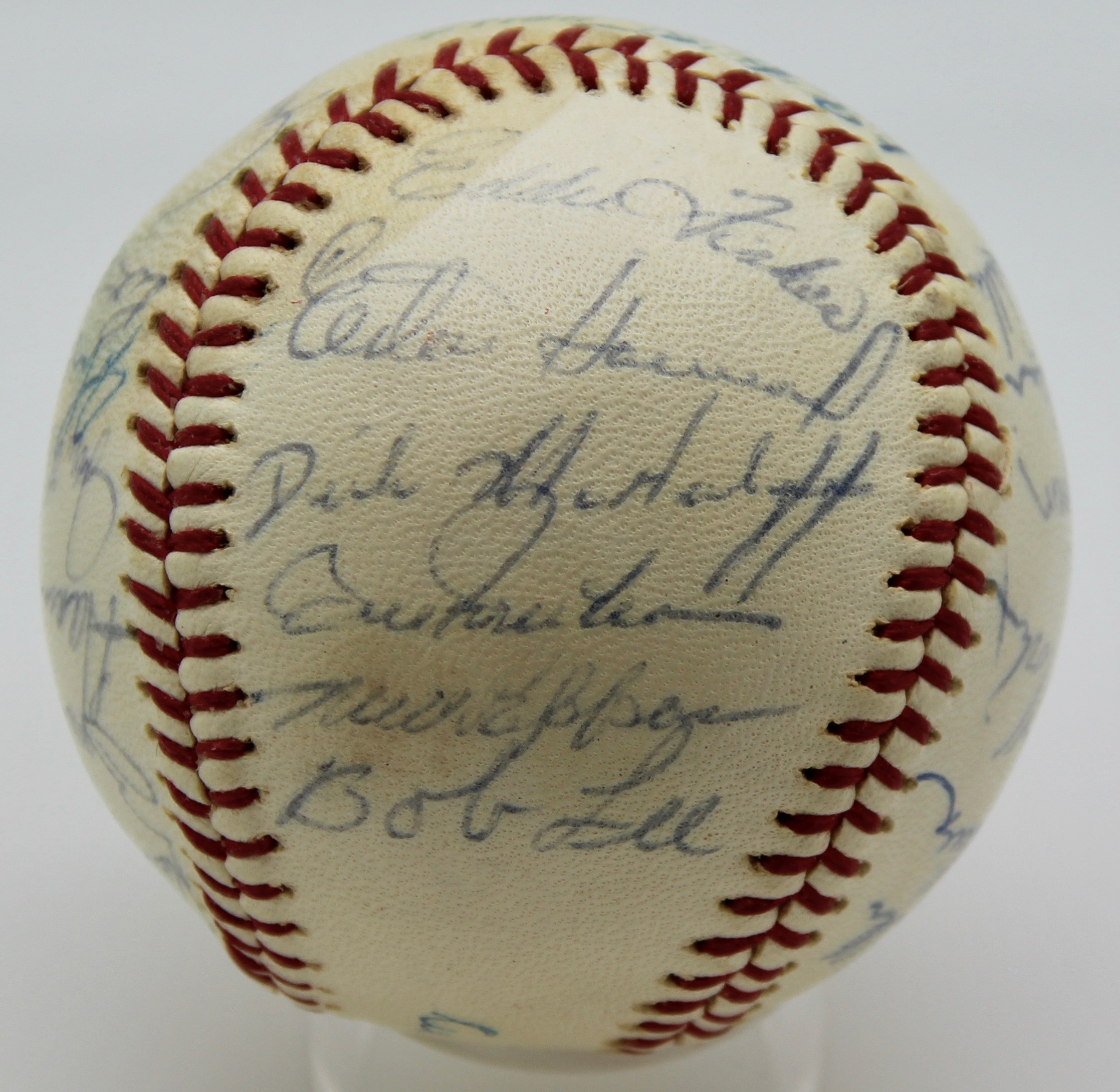 Official National League baseball. Hand-signed in blue ink pen by (25) of the 1965 American League All-Stars including Al Lopez, Eddie Fisher, Elston Howard, Dick McAuliffe, Bill Freehan, Milt Pappas, Bob Lee, Earl Battey, Sam McDowell, Bob Richardson, Mel Stottlemyre, Max Alvis, Vic Davalillo, Tony Olivia, Willie Horton, Brooks Robinson, Al Kaline, Felix Mantilla, Rocky Colavito, Zoilo Versalles, Harmon Killebrew, Jimmie Hall, John O'Donoghue, Pete Richert and Jim Grant.
