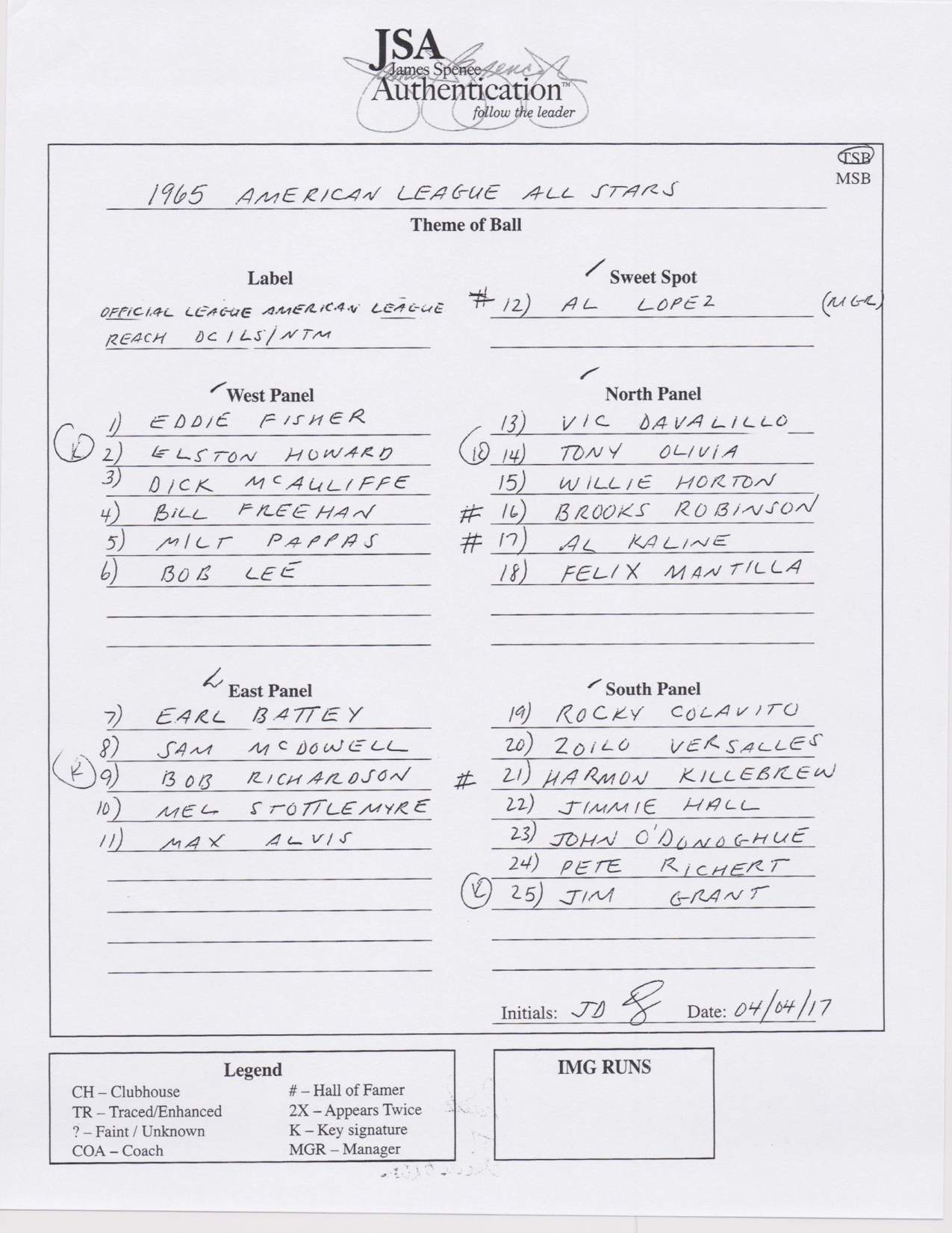 1965 American League All-Stars OAL Baseball Signed by (25) with Al Lopez, Eddie Fisher, Harmon Killebrew, Al Kaline, Brooks Robinson (JSA LOA)
