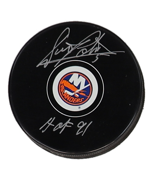 New York Islanders logo hockey puck has been hand-signed and inscribed by Denis Potvin (HOF).