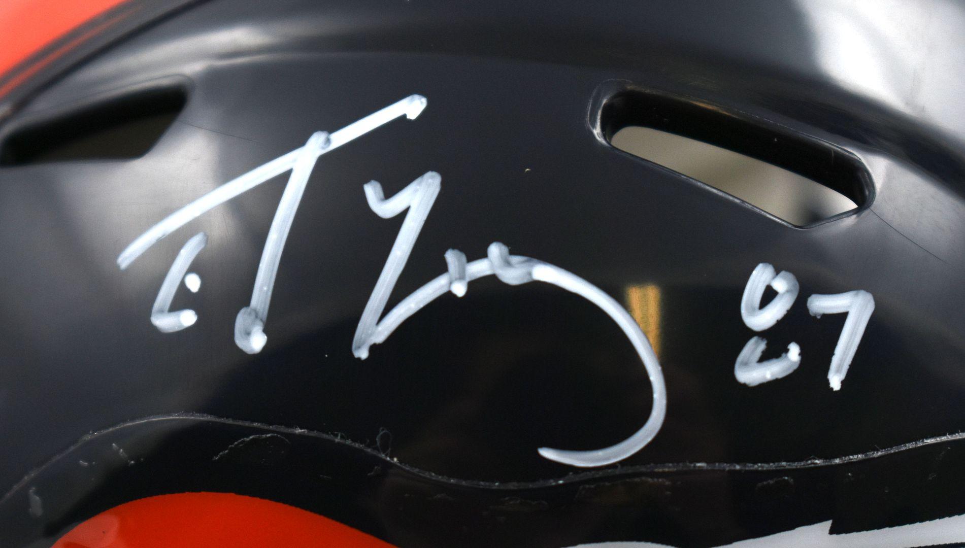 Riddell Denver Broncos Speed mini helmet has been hand-signed by Ed McCaffrey.