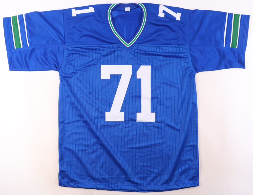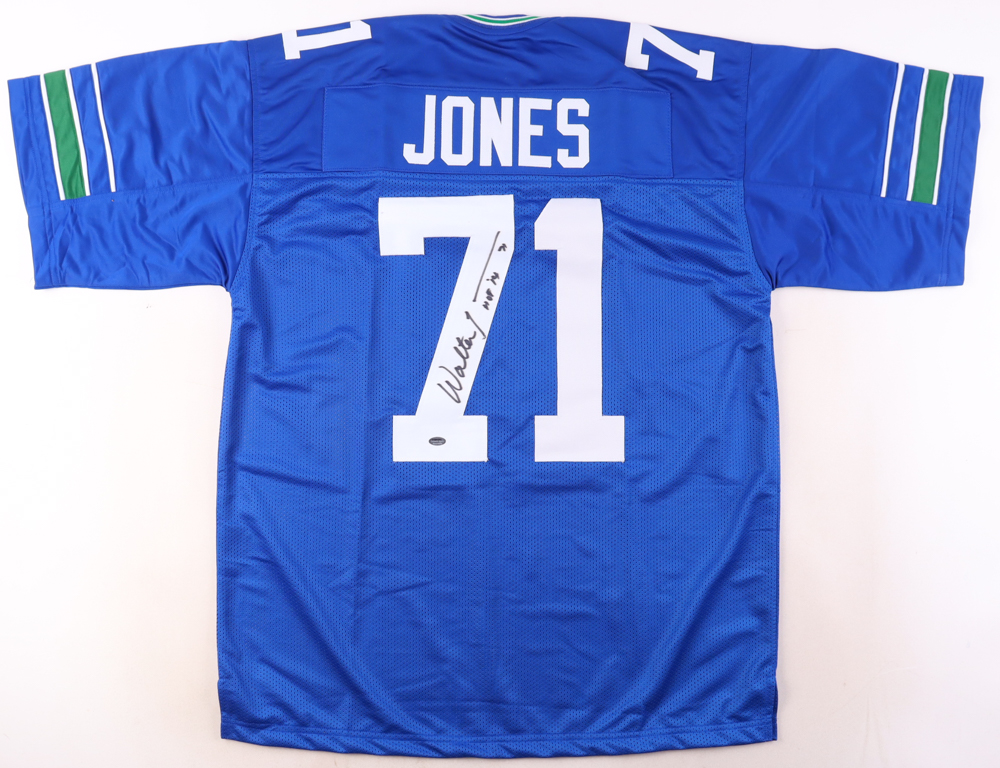 Custom jersey with everything sewn on, size XL. Hand-signed and inscribed by Walter Jones (HOF).