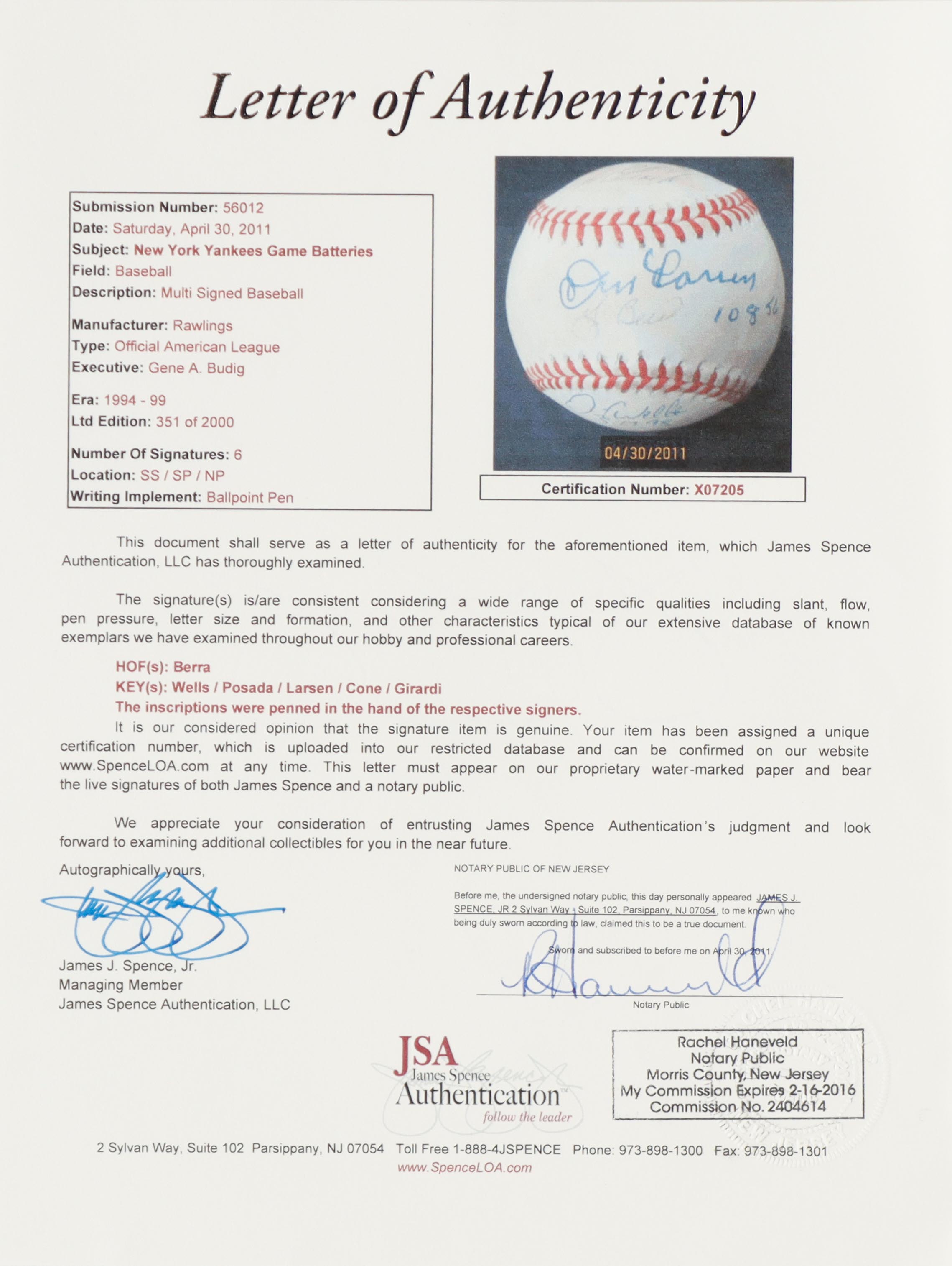 Yogi Berra, Don Larsen, David Wells | Yankees LE Game Batteries Baseball Signed By (6) (JSA)