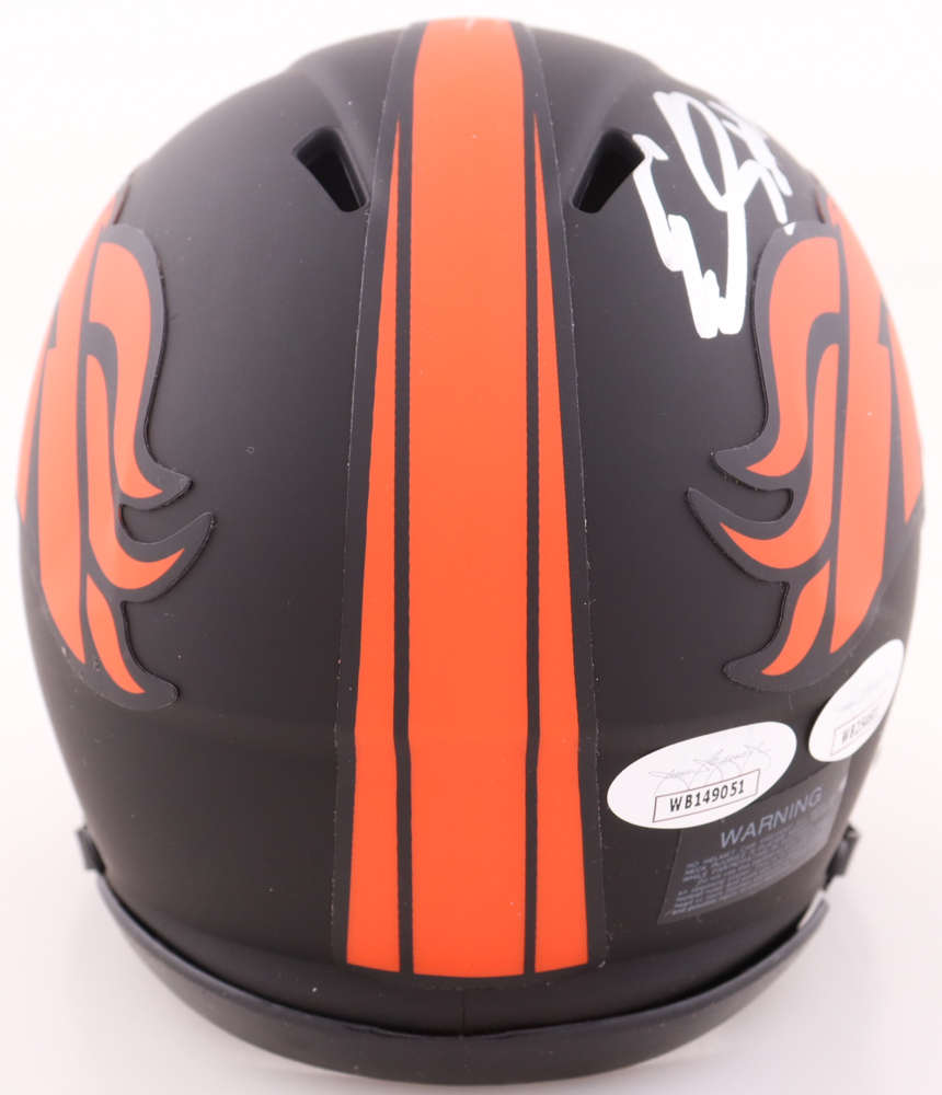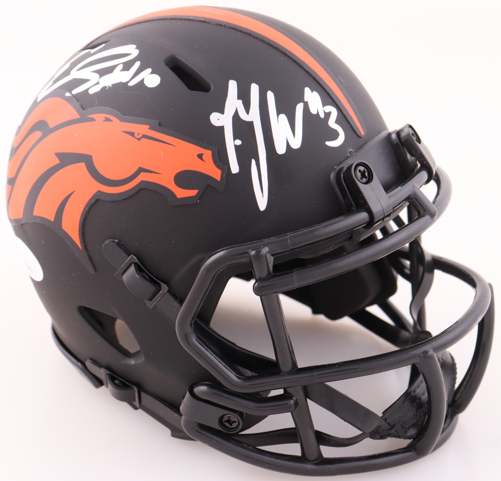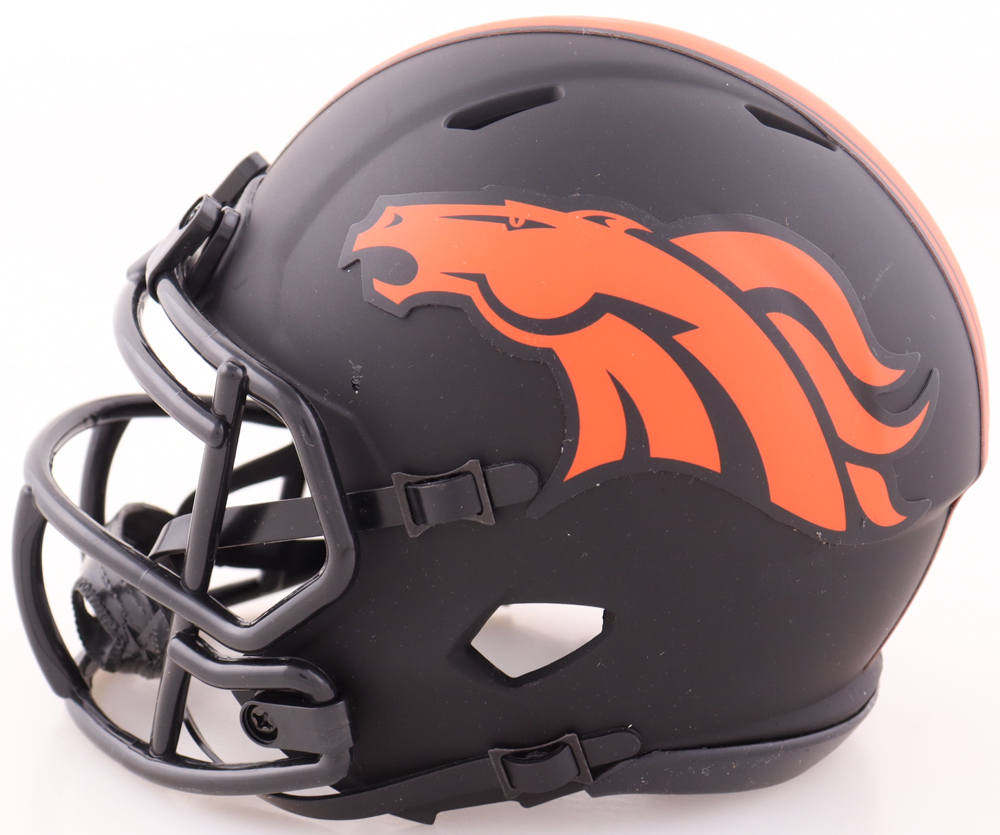 Riddell Denver Broncos Eclipse Alternate speed mini helmet. Hand-signed by Emmanuel Sanders and TJ Ward.