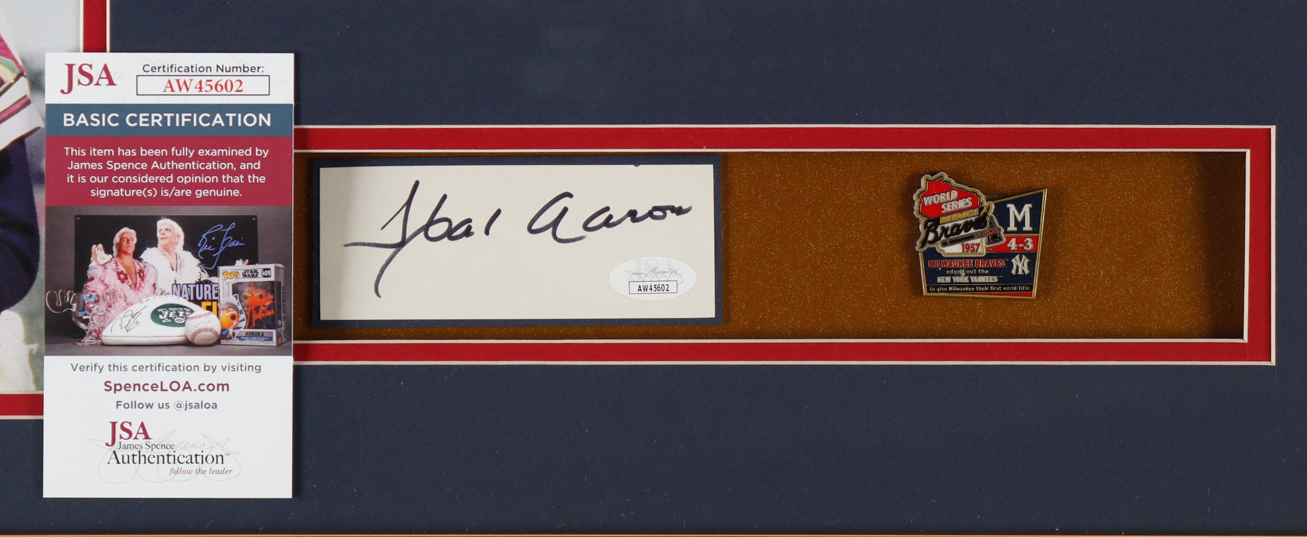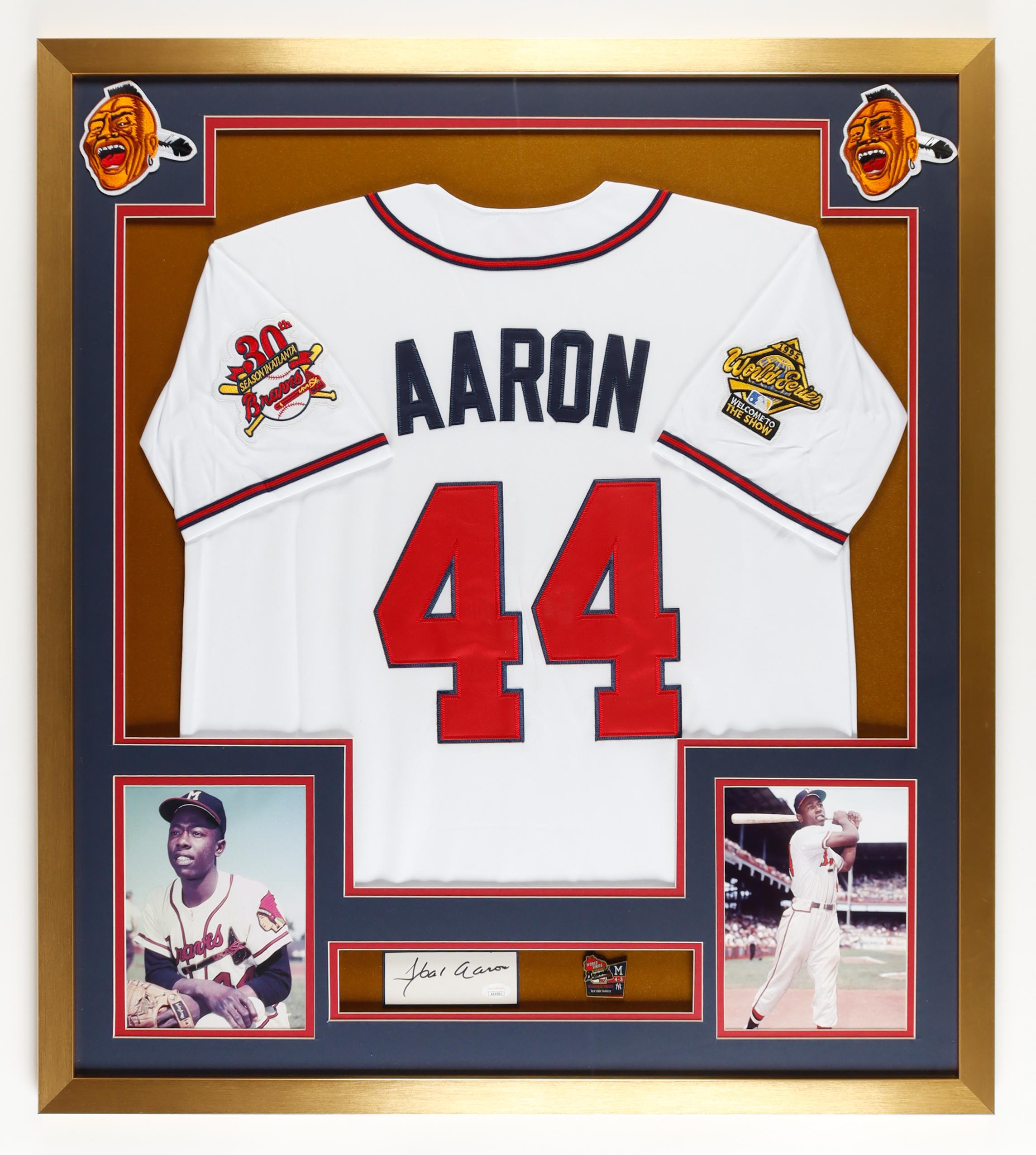 Custom frame measures approximately 32" x 36" in size and features a cut that has been hand-signed by Hank Aaron (D. 2024, Milwaukee Braves, HOF). The display also includes an unsigned Jersey, (2) Photos, (2) Retired Milwaukee Braves Patches, and 1957 World Series Pin.