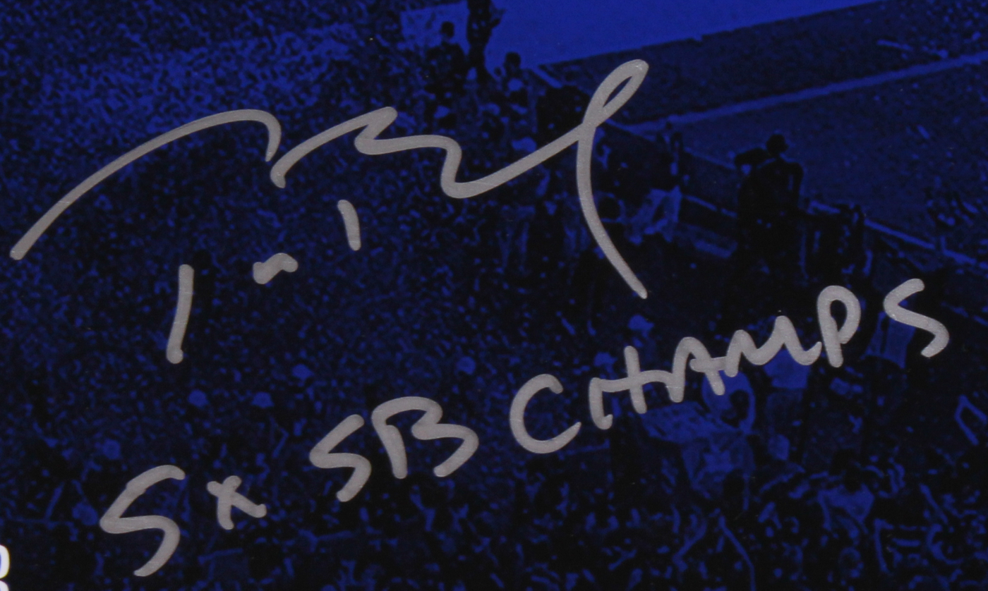 Custom framed measures 24" x 41" in size. Features an 18" x 36" photo that has been hand-signed and inscribed in silver paint pen by Tom Brady (Patriots). The photo is limited edition and hand-numbered #1/12.