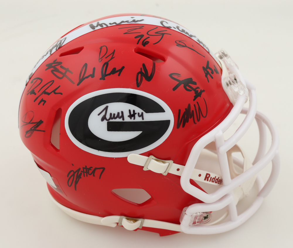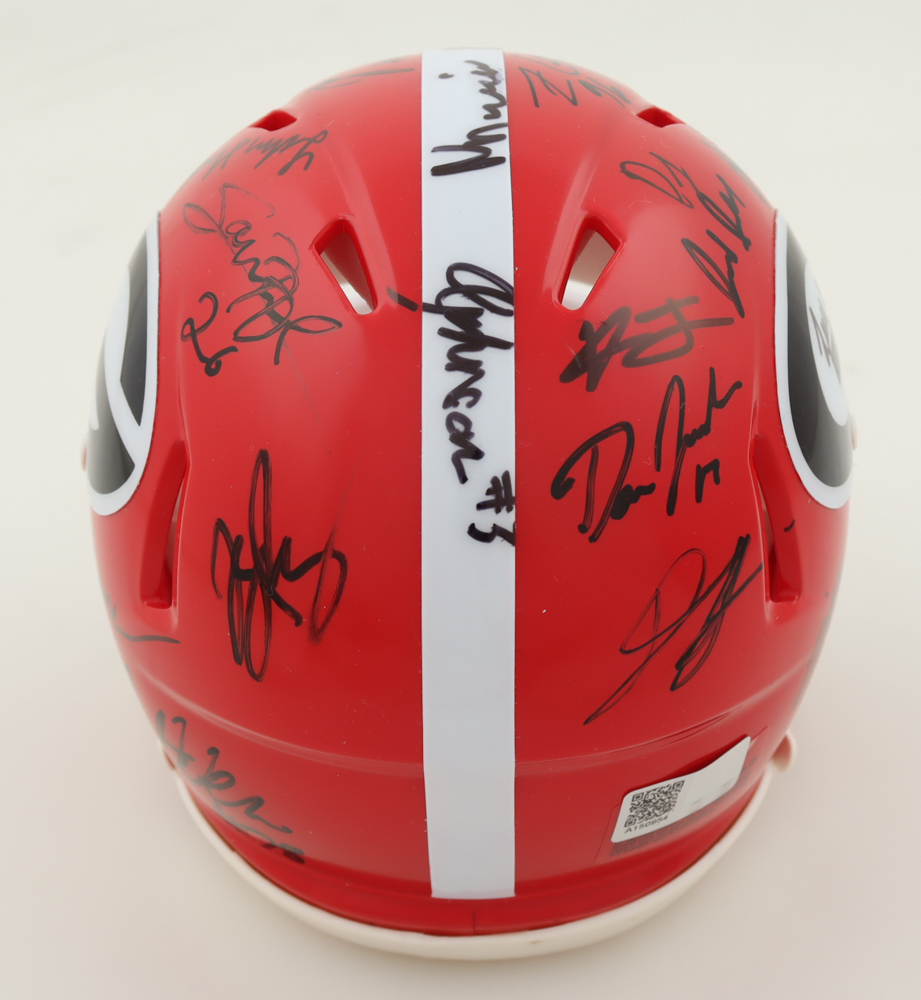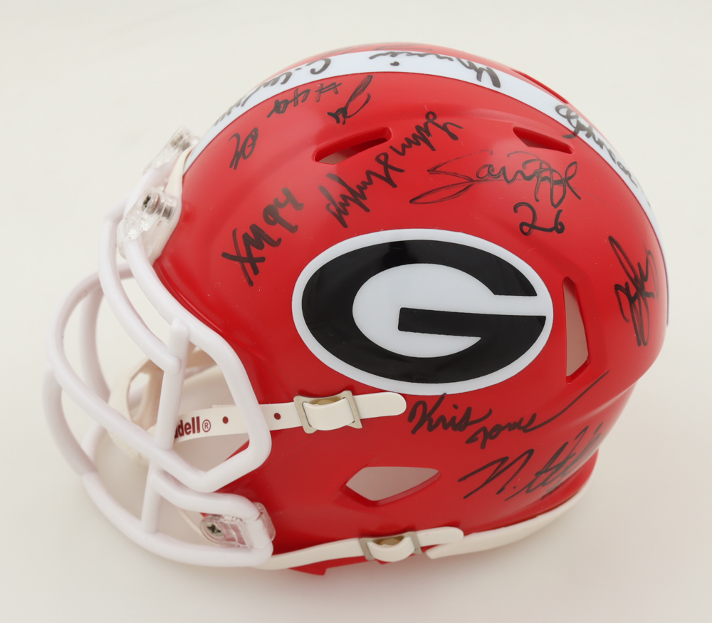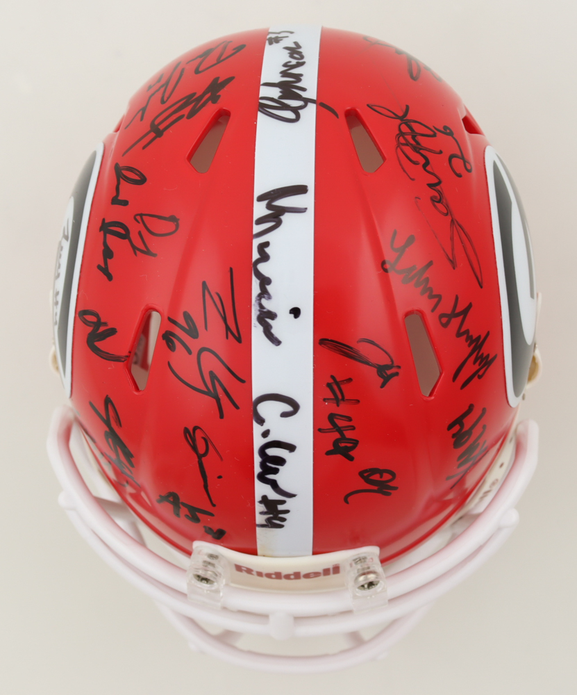 Riddell Georgia Bulldogs Speed Mini Helmet. Team-signed by (34) with Brock Vandagriff, Dominic Lovett, KJ Bolden, Sam Bush, Jamaal Jarrett, Julian Humphrey, Dan Jackson, Tyler Williams, Xzavier McLeod, Nazir Stackhouse, Dylan Fairchild, Jackson Meeks, Micah Morris, William Mote, Jared Wilson, Arian Smith and (18) others.