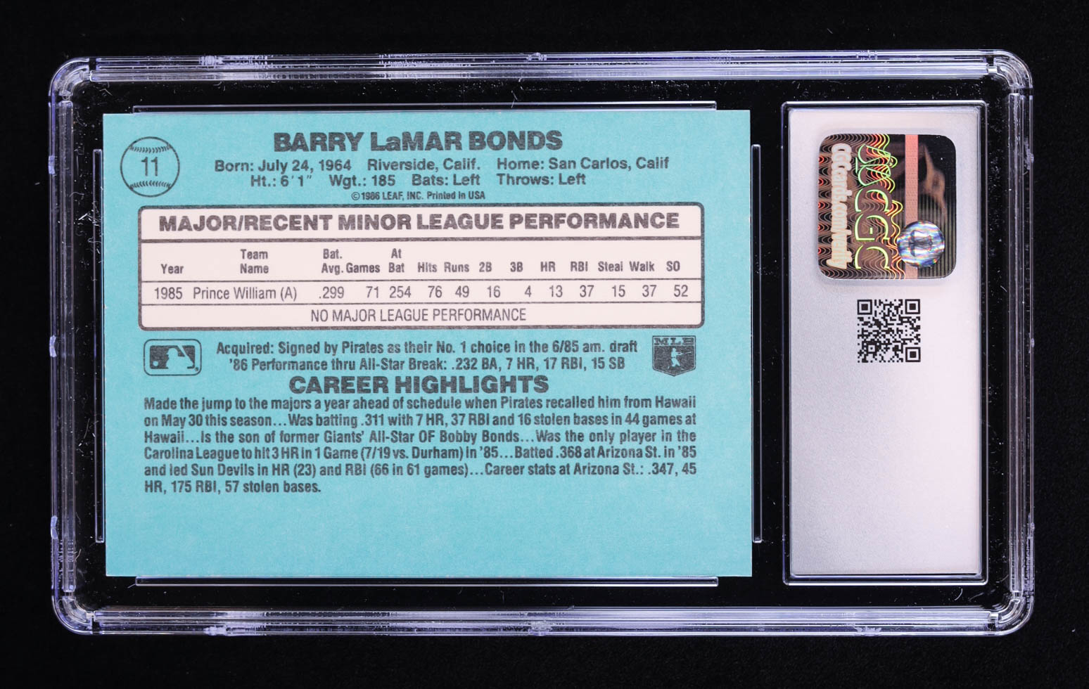 Barry Bonds 1986 Donruss Rookies #11 RC (CGC 10)