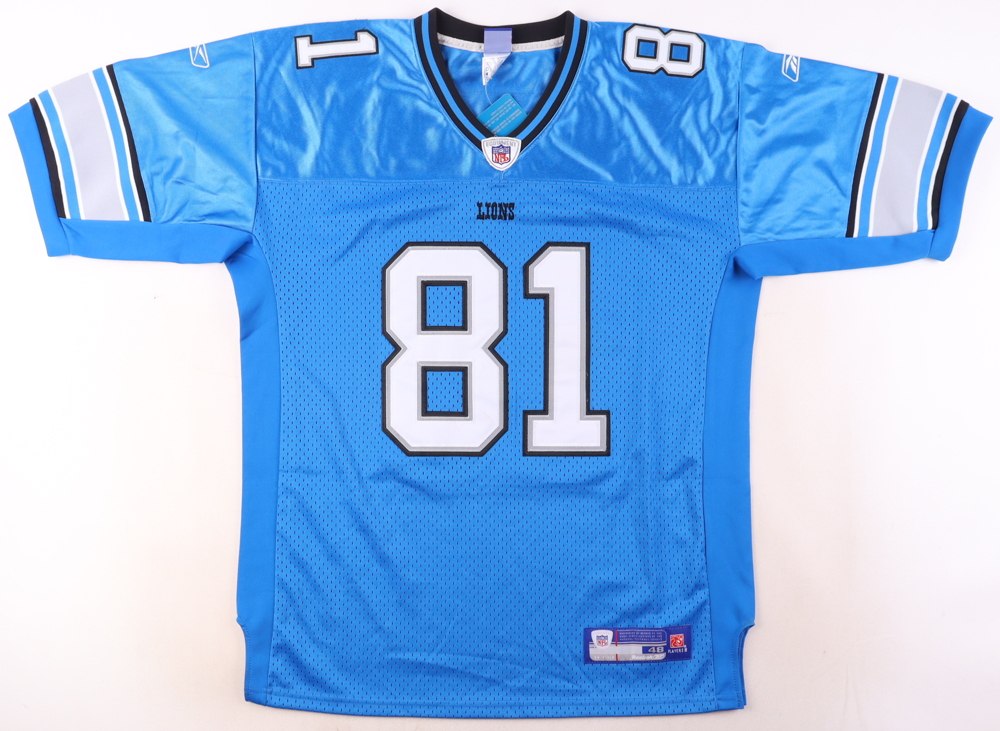 Reebok jersey with everything sewn on, size 48. Has been hand-signed by Calvin Johnson (Detroit Lions, HOF).
