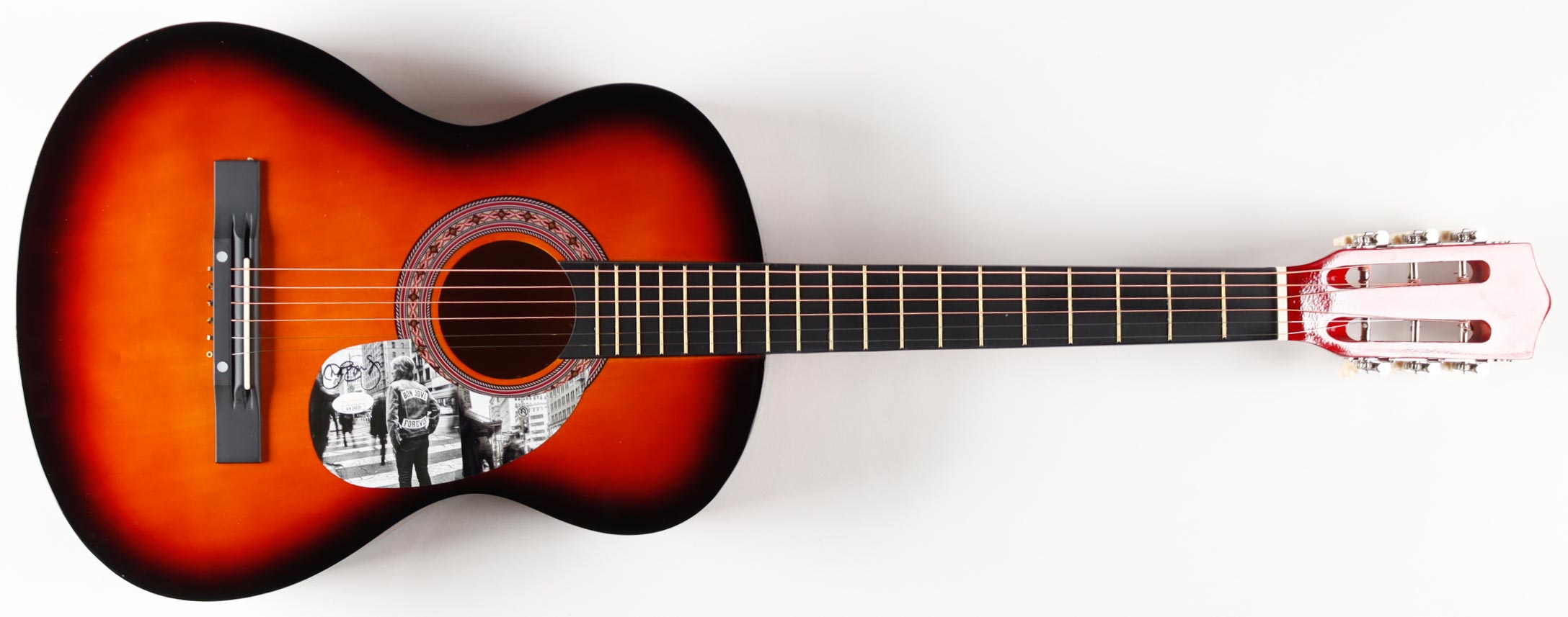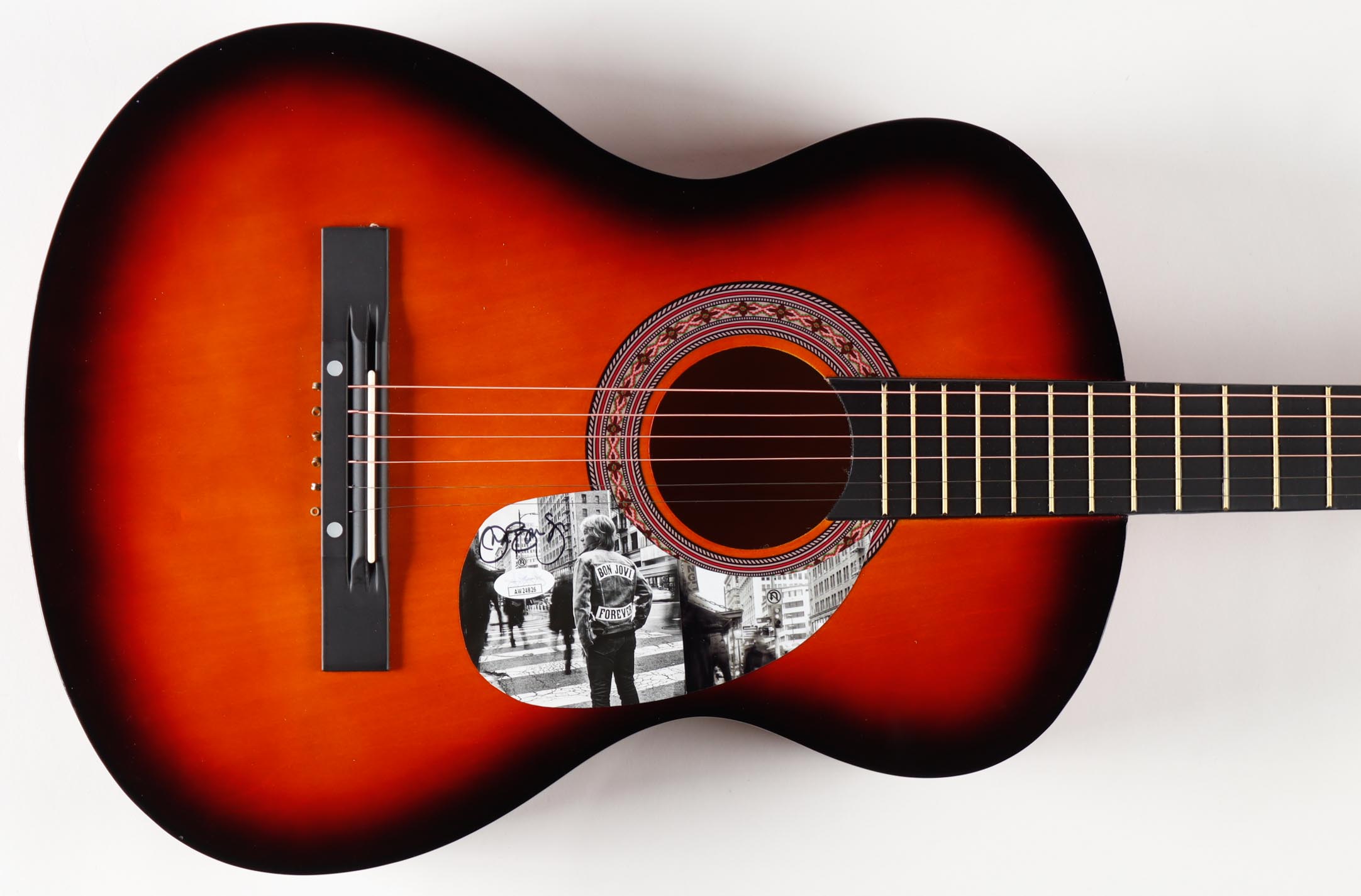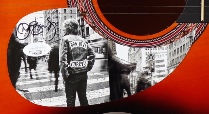 Acoustic guitar measures approximately 38" in length and has been hand-signed on a cut that has been repurposed as the pick-guard by Jon Bon Jovi.