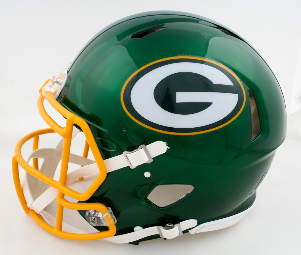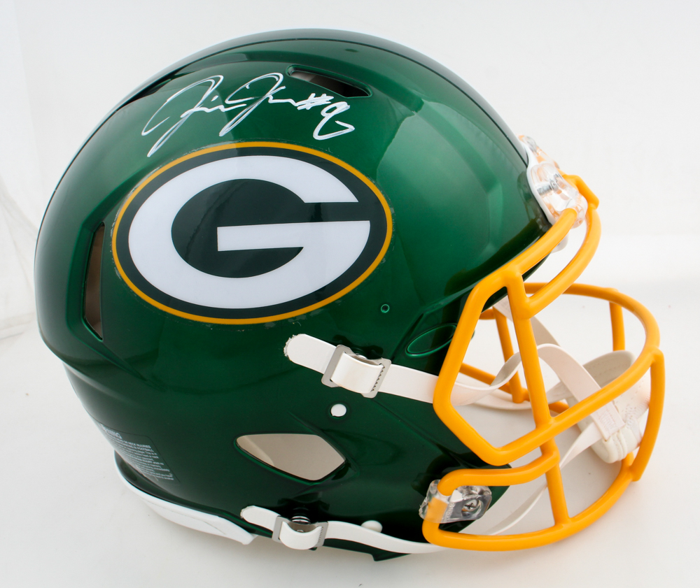 Riddell Green Bay Packers full-size authentic on-field flash alternate speed helmet has been hand-signed by Josh Jacobs.