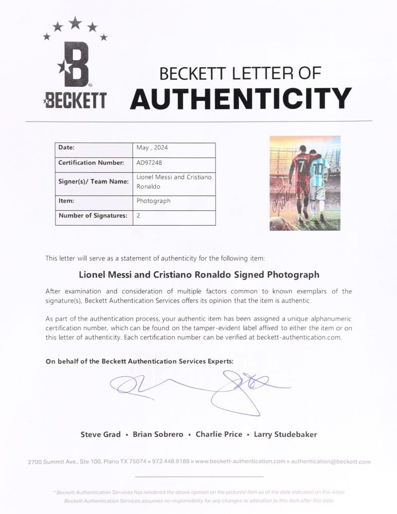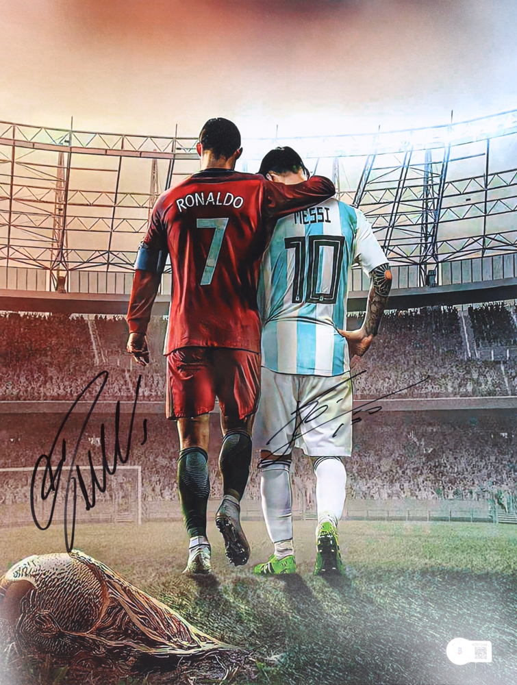 Photo measures 12” x 16” in size and has been hand-signed by Lionel Messi (Team Argentina) and Cristiano Ronaldo (Team Portugal).