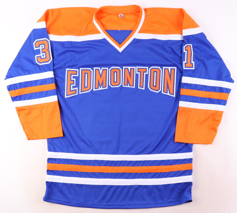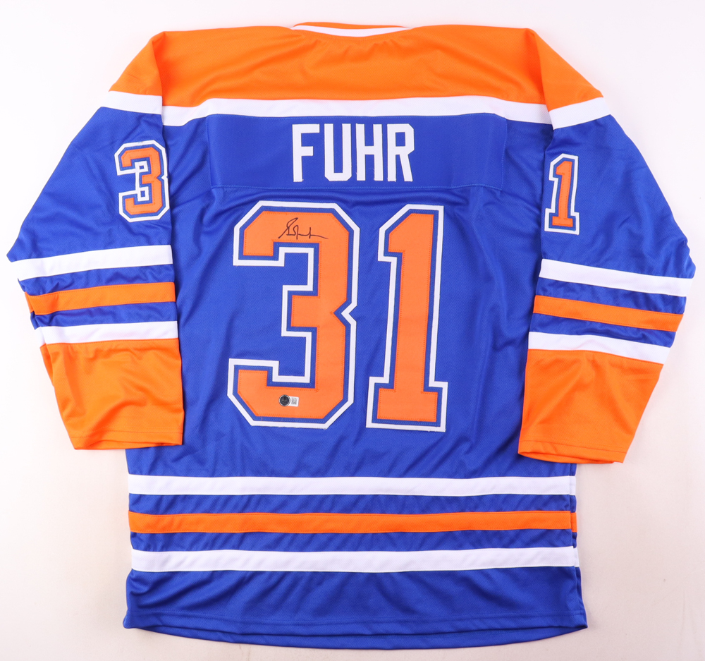 Custom jersey with everything sewn on, size XL. Has been hand-signed by Grant Fuhr (HOF).
