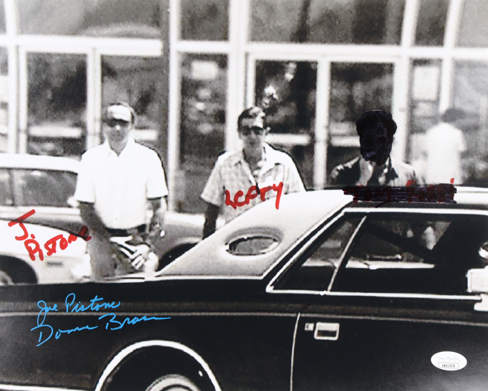 Photo measures 11" x 14" in size and has been hand-signed by Joseph Pistone. Pistone has hand-labeled labeled himself, "Lefty" Ruggiero and facetiously labeled and "redacted" Tony Rossi - another FBI agent - present when the picture was taken.