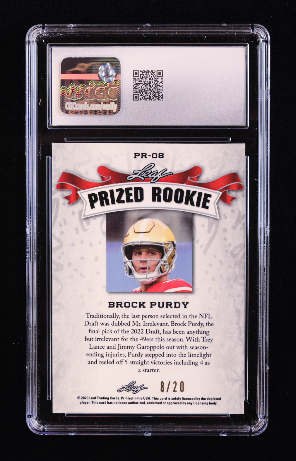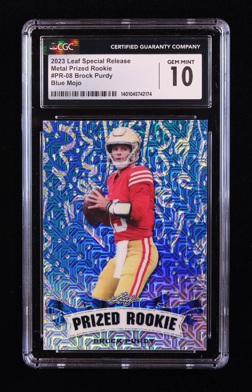 Brock Purdy 2023 Leaf Metal Special Release Prized Rookie Mojo Blue #PR08 RC #8/20 (CGC 10)