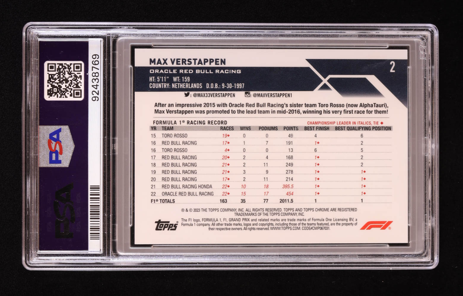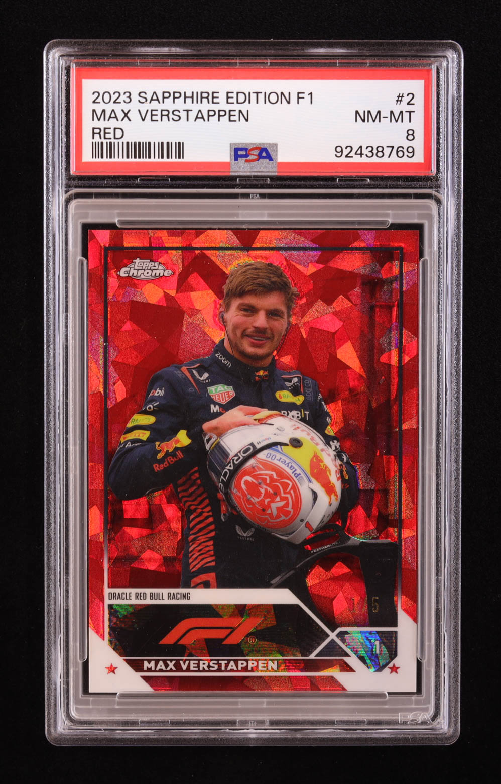 Max Verstappen 2023 Topps Chrome Sapphire Formula 1 Red Refractors #2 #1/5 (PSA 8)