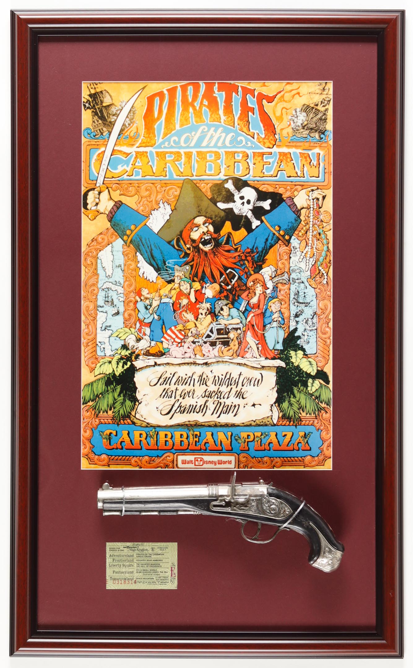 Disneyland "Pirates of the Caribbean" Custom Framed Poster Print Display with Park Ticket & Replica Prop Pistol